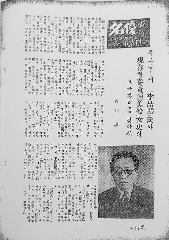 잡지 《영화세계》 기자 신분으로 명동에서 수많은 영화인들과 만난 노만은 이들과의 친분을 계기로 영화배우들의 가정을 직접 방문하여 나눈 인터뷰 '명우 가정 탐방기'를 연재했다. 지난 11월호의 전창근에 이어 12월호에서는 배우 조미령과 그의 부군인 제작자 이철혁의 왕십리 자택을 직접 방문하여 나눈 인터뷰 기사를 수록한다. <푸로듀-서 '이철혁'씨와 현존한 춘향 '조미령' 여사의 보금자리를 찾아서>라는 제목으로 실린 이 기사 역시 'N기자'라는 필명으로 쓰여졌다. 여기에 나누어 소개한다.