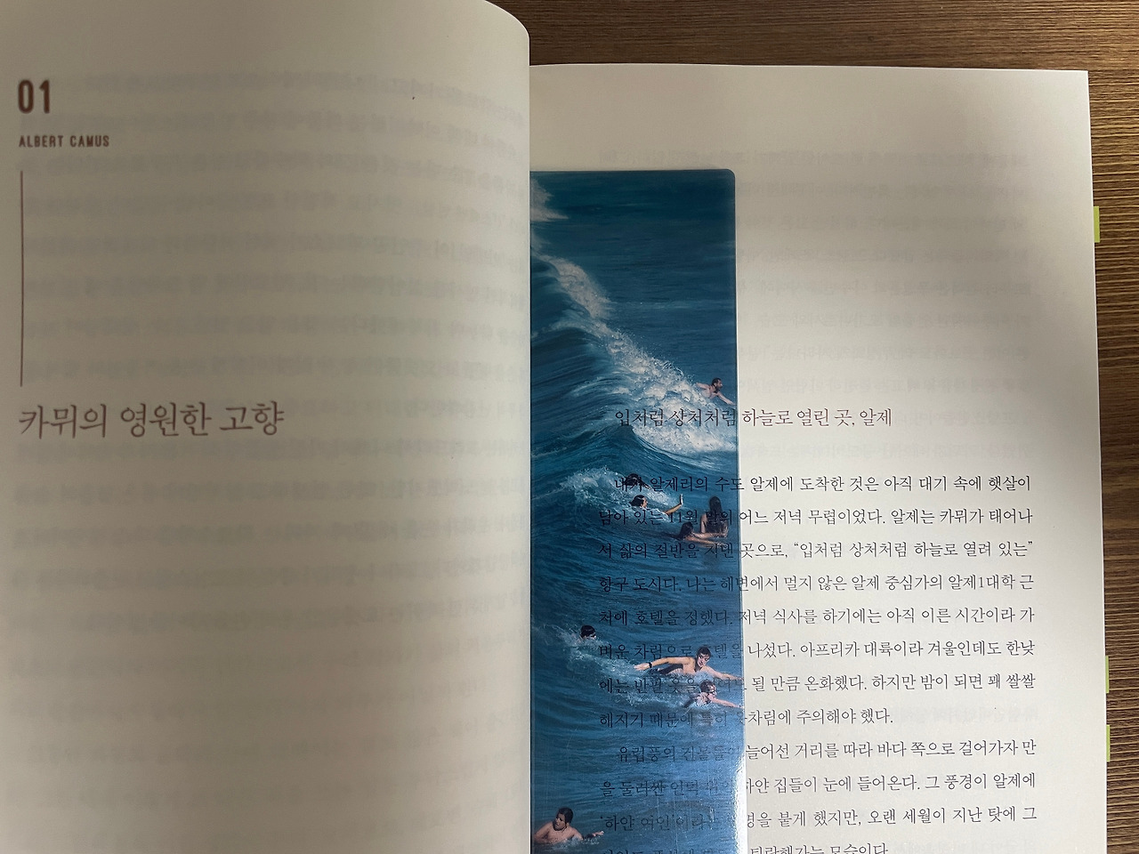 이제 제법 후끈하게 데워진 바깥공기가 집안의 응달 사이사이로 비집고 들어온다. 그런 오후의 아파트 방 안에서 나는 책장을 들여다보았다. 이미 내 옆에는 한창 진행 중인 <마의 산>이 놓여있었지만, 그 순간의 나는 새로운 텍스트를 원하고 있었다. 그때 나의 두 눈이 책 하나에 휘말렸고, 반사적으로 손을 뻗어 그것을 집어 들었다. 카뮈에 관한 책이었다. 몇 년 전에 한 번 읽었었지만 내용은 잘 기억이 나지 않았다. 나는 책의 내지를 빠르게 훑었다. 지중해의 생생한 삽화가 담겨 있는 이 책을 지금 당장 읽고 싶다는 충동이 들었다. 자리에 앉아서 띠지도 벗기지 않고 표지를 펼쳤다. 양복을 입은 멋진 모습의 카뮈가 담벼락에 앉아 있었다. 이후 수록된 몇 개의 사진을 감상한 후, 글을 읽기 시작했다.