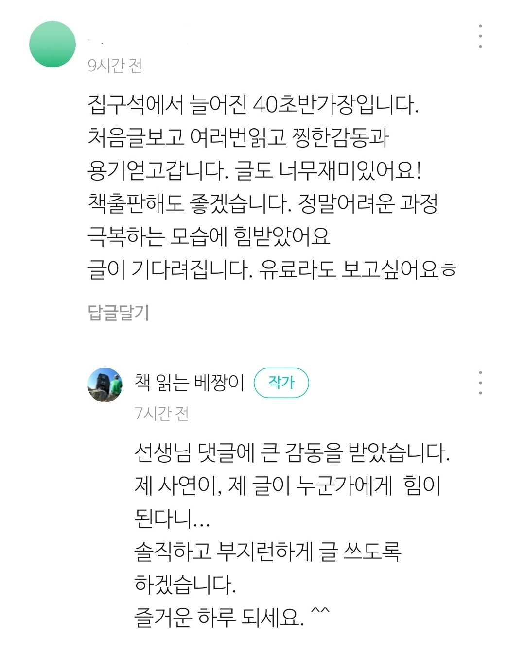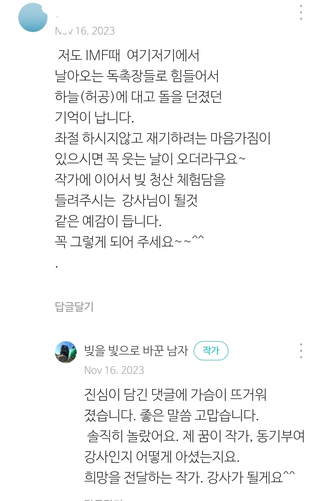 부족한 사람의 글에 응원을 보내주신 독자 분들에게감사를 드린다. 브런치 안에서 속 시원하게 아픔을 풀었다. 서러웠던 기억이 나서 울고, 댓글에 울고, 참 좋은 경험을했다. 2024년 등산으로 건강을 챙기고 건강한 글을 꾸준히 쓸 것이다.