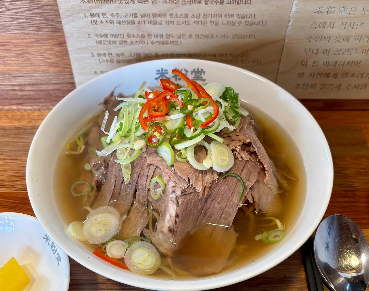 노량진 근처에서 오전 일정을 마친 후, '미분당 노량진점'으로 향했다. 차돌쌀국수를 먹었는데, 너무 맛있었다. 여기는 해선장과 칠리? 그 좀 매운 소스를 취향에 맞게 조합해 함께 먹으면 더 맛있다. 앞 그릇을 따로 주기 때문에 다양하게 조합해 먹으면 좋다. 반찬으로 나오는 양파, 단무지도 맛있다.