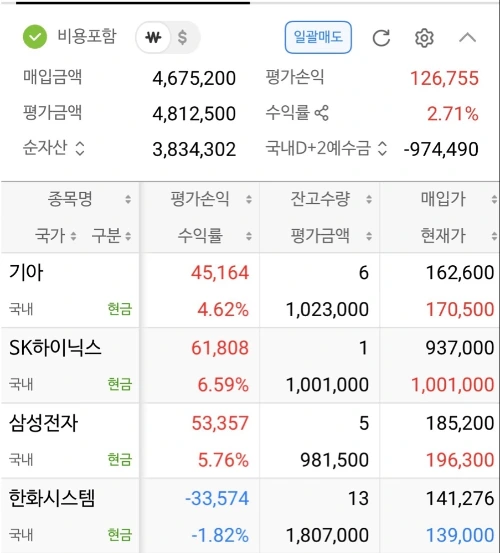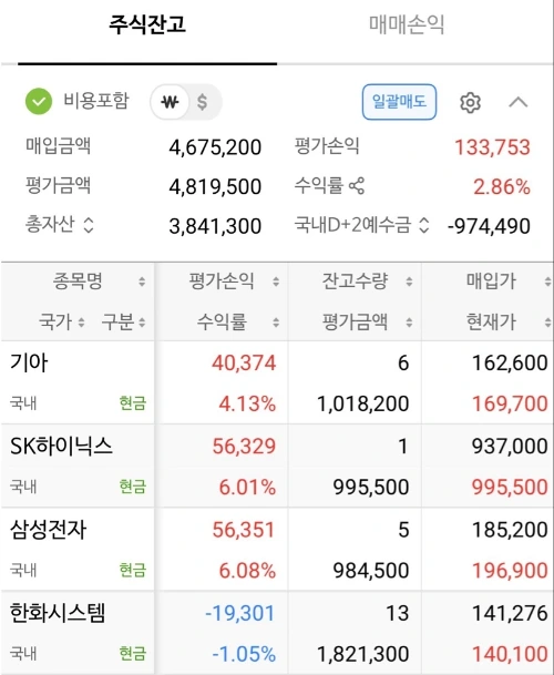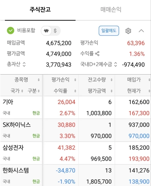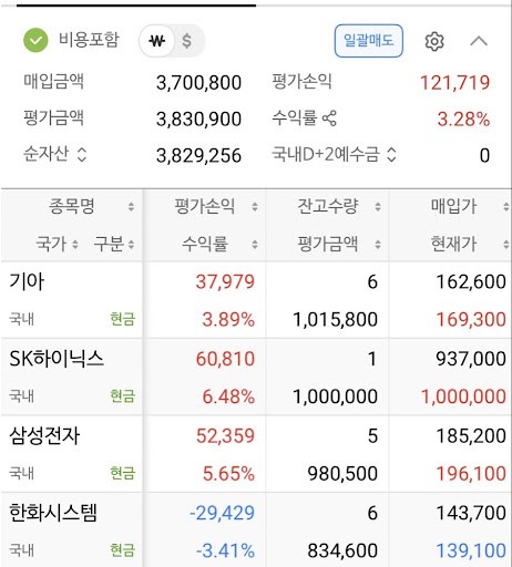 낮 한때 12만 원까지 치솟았던 수익금은 최종 6만 원대로 마감됐다. 사람 마음이 참 간사하다. 분명 어제보다 벌었는데, 이상하게 6만 원을 잃은 기분이 든다. SK하이닉스는 백만닉스 고지 앞에서 멈췄고, 삼성전자도 20만전자가 되지 못했다. 그나마 기아가 선방해 수익금을 높여준 것에 만족해야 했다.
