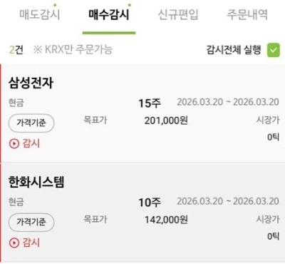 장이 열리기 전부터 긴박했다. 제미나이는 예약 매도를 지시했다. SK하이닉스는 98만 원, 기아는 16만 5,000원 이탈 시 매도되도록 설정했다.