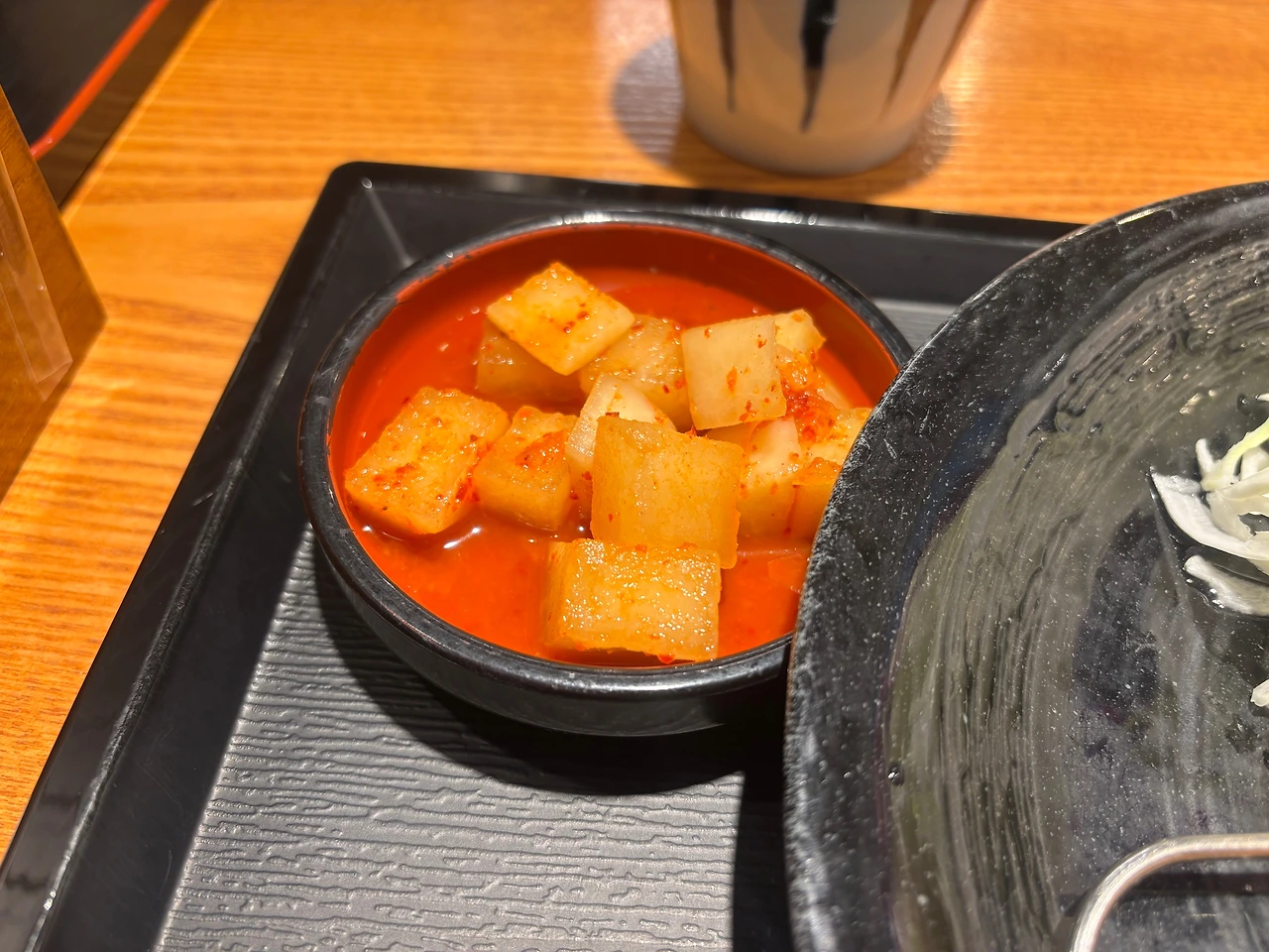 배가 고파 허겁지겁 먹었다. 밥 한입, 돈가스 한입, 국물 한 모금. 샐러드 한입, 돈가스 한입, 우동 한 젓가락.물릴 땐 깍두기다.