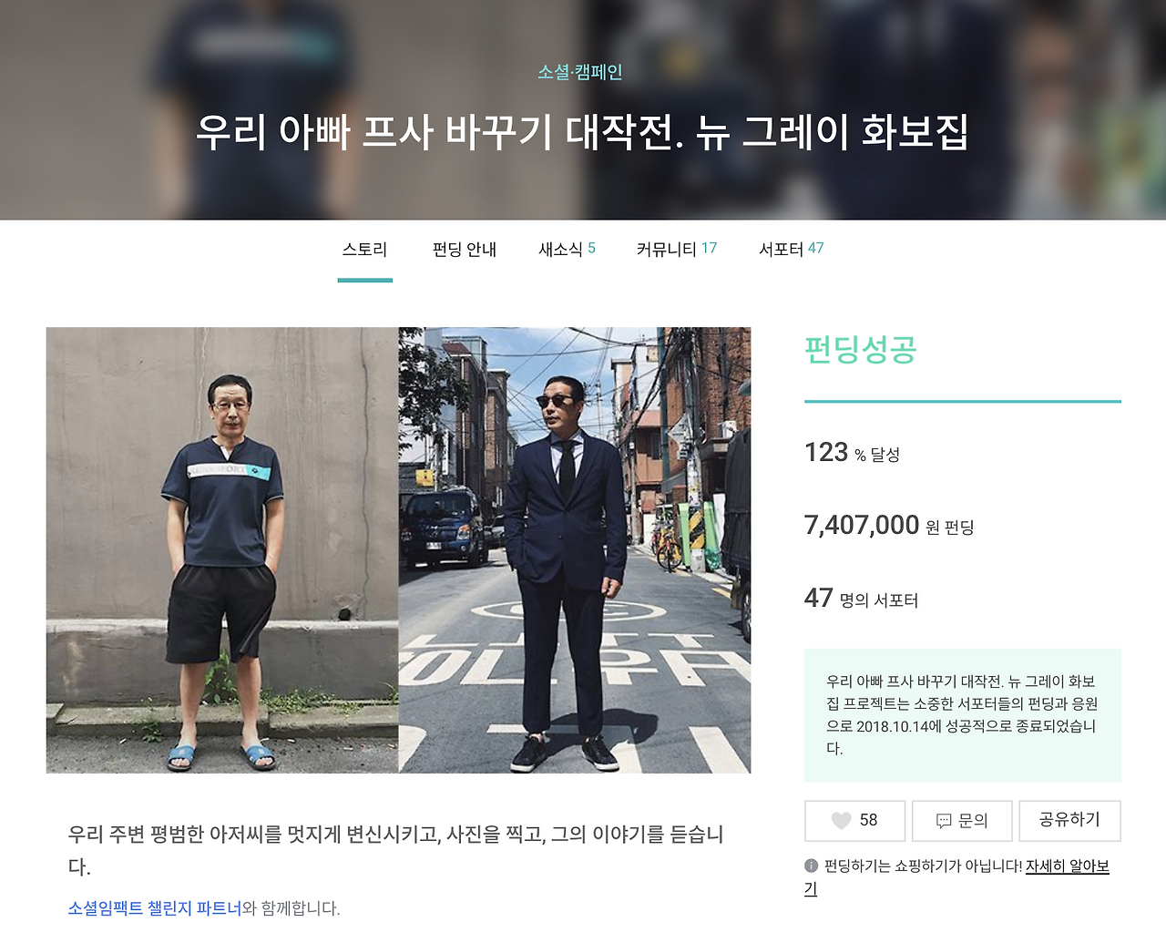 어쨌든 그렇게 9월 말, "우리 아빠 프사 바꾸기, 더뉴그레이(THE NEW GREY) 프로젝트" 펀딩을 오픈했다. 그리고, 정확히 17분 만에 펀딩은 마감되었다.