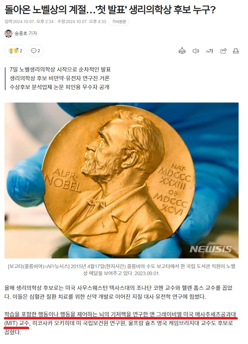 2. 뇌의 기저핵 (Basal gaglia)에 대하여 : 기저핵은 습관이나 훈련, 보상 등을 관장하는 뇌영역이라고 합니다. 반복된 훈련으로 강화된 시냅스들이 저장된 곳으로 알려져 있습니다. 운동의 시작이 어려운 파킨슨병이 기저핵의 이상과 연관됩니다. 사진으로 첨부한 것처럼 MIT의 앤 그레이비엘 교수팀은 기저핵에 대한 연구로 강력한 노벨상 후보로 점쳐졌습니다.
