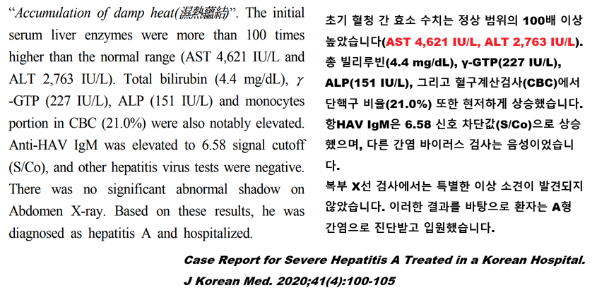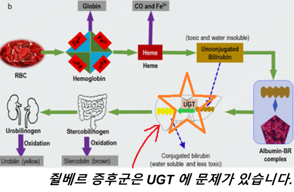 21. 그런데 저와 같은 1차 의원에서 빌리루빈 상승의 원인은 대부분 질베르 증후군 (Gilbert syndrome)으로 결론을 내립니다. 인구의 약 5% 정도에서 '간의 재처리 과정 (UDP-glucuronyltransferase)'에 결함이 있는 탓에 재처리 속도가 느려지고(약 30% 성능) 처리되지 못한 '독한' 빌리루빈이 혈중에서 검출됩니다. 질베르 증후군의 경우 빌리루빈이 웬만하면 4-5 mg/dL 는 넘지 않고, 다른 생화학 검사나 간 초음파 검사는 정상 소견을 보이는 특징이 있습니다. (17번에서 오해하시지 마라는 이유가 여기에 있습니다.)