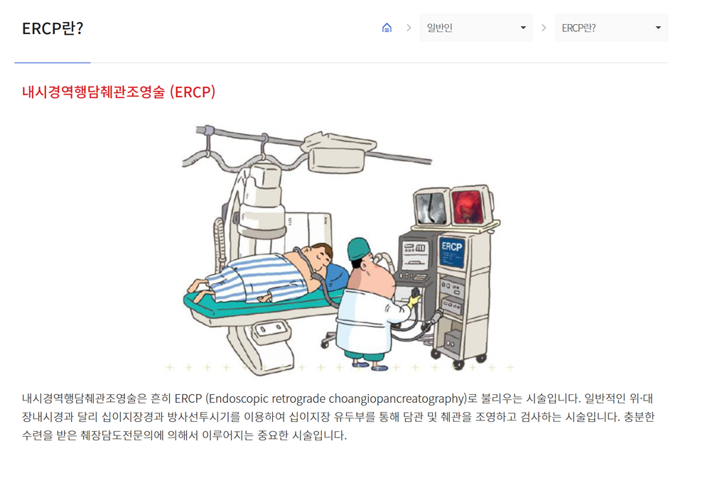 20. 만약 4) 번의 문제로 빌리루빈이 상승했다는 것이 확인되면 의사들은 매우 긴장합니다. 말 그대로 큰일이 날 수 있습니다. 하지만 절대 오해는 마십시오. 빌리루빈이 올라서가 아니라 담즙 때문입니다. 이때 종합병원 등에서 시행되는 시술이 바로 ERCP, 내시경역행담췌관조영술 입니다. 내시경으로 담즙이 나오는 길을 되짚으며 어디에서 막혔는가를 찾는 시술입니다.