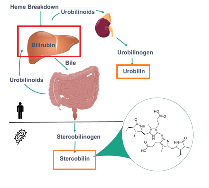 11. 간에서 재처리 과정을 마친 '순한' 빌리루빈(직접 빌리루빈)은 담즙에 녹은 뒤 변에 섞여 무사히 몸 밖으로 배출됩니다. 아참, 찌꺼기인 빌리루빈은 색을 띱니다. 담즙이 시커먼 것도 빌리루빈 탓이고, 대변이 갈색인 것도 빌리루빈 탓이고, 소변이 노란 것도 빌리루빈 탓입니다.