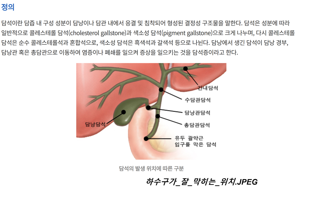 19. 4) 번의 상황이 가장 직관적이며 이해하기 쉽습니다. 이것은 정말 말 그대로 꽉 막힌 탓에 '하수구가 역류하는 상황'과 비슷하기 때문입니다. 담석이나 담도암 등이 대표적입니다. 담즙이 나가야 할 길(담도)을 막으면 담즙도 정체되고 빌리루빈도 함께 정체됩니다. 총빌리루빈이 높아졌을 때 의사들이 간초음파를 보겠다고 하는 것은 바로 이 4) 번을 의심해서 하는 제안하는 것입니다.