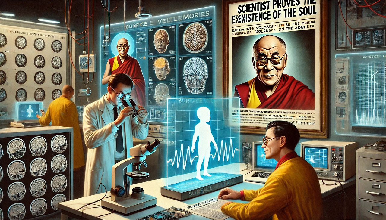 "답보 상태에서 마침내 티베트 불교의 달라이 라마의 윤회설에서 아이디어를 얻은 한 과학자가 인간성은 뇌나 다른 인체의 장기에 있지 않고 피부 표면에 얇게 덮인, 막과도 같은 '전자기장'의 형태라는 것을 증명해 내었습니다!