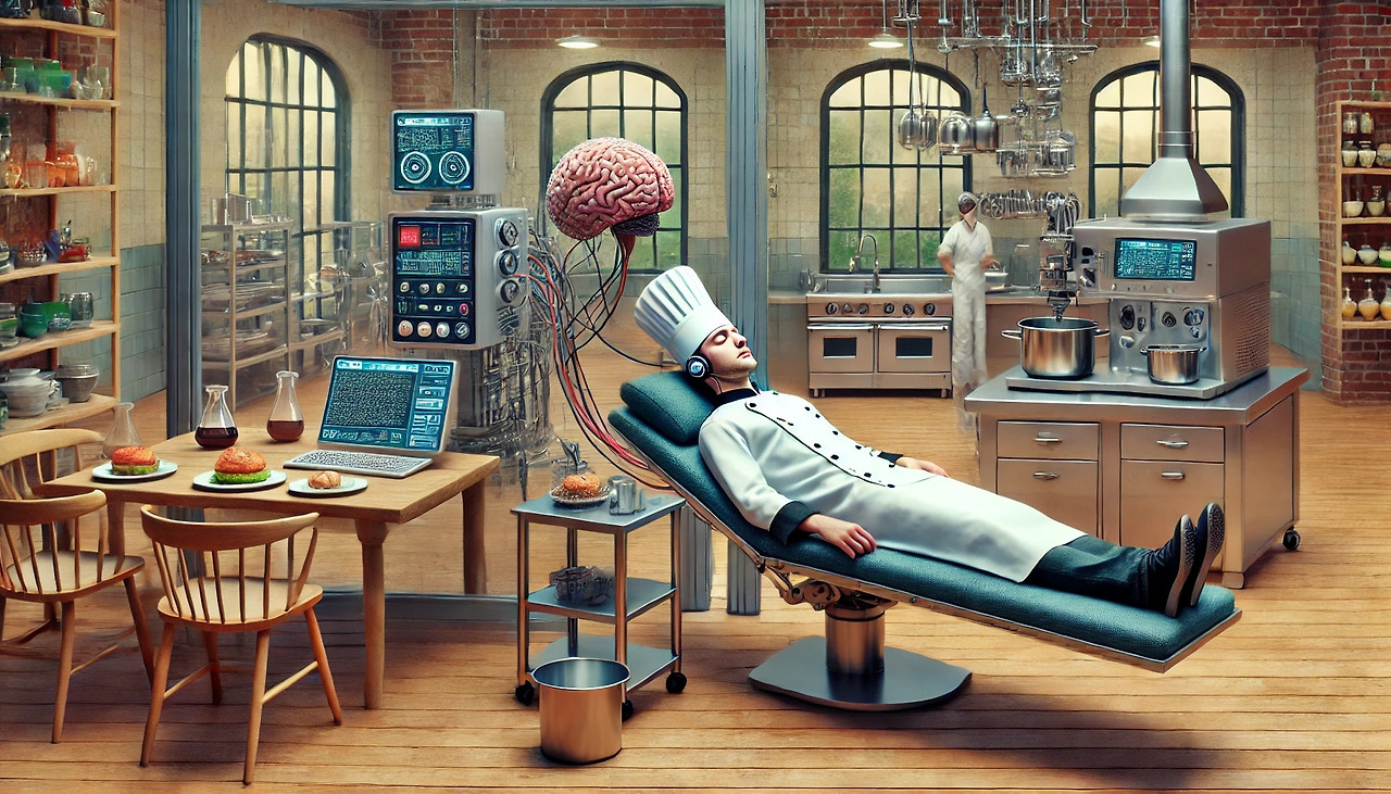 세 번째 영상은 '사람과 대화할 수 있게 된 기계'라는 제목이 붙어 있었다. 화면에는 눈을 감은 요리사가 건너편 방에 누워 '기계를 통해' 간을 보고 '기계로' 음식을 조리하는 장면이 재생되고 있었다.
