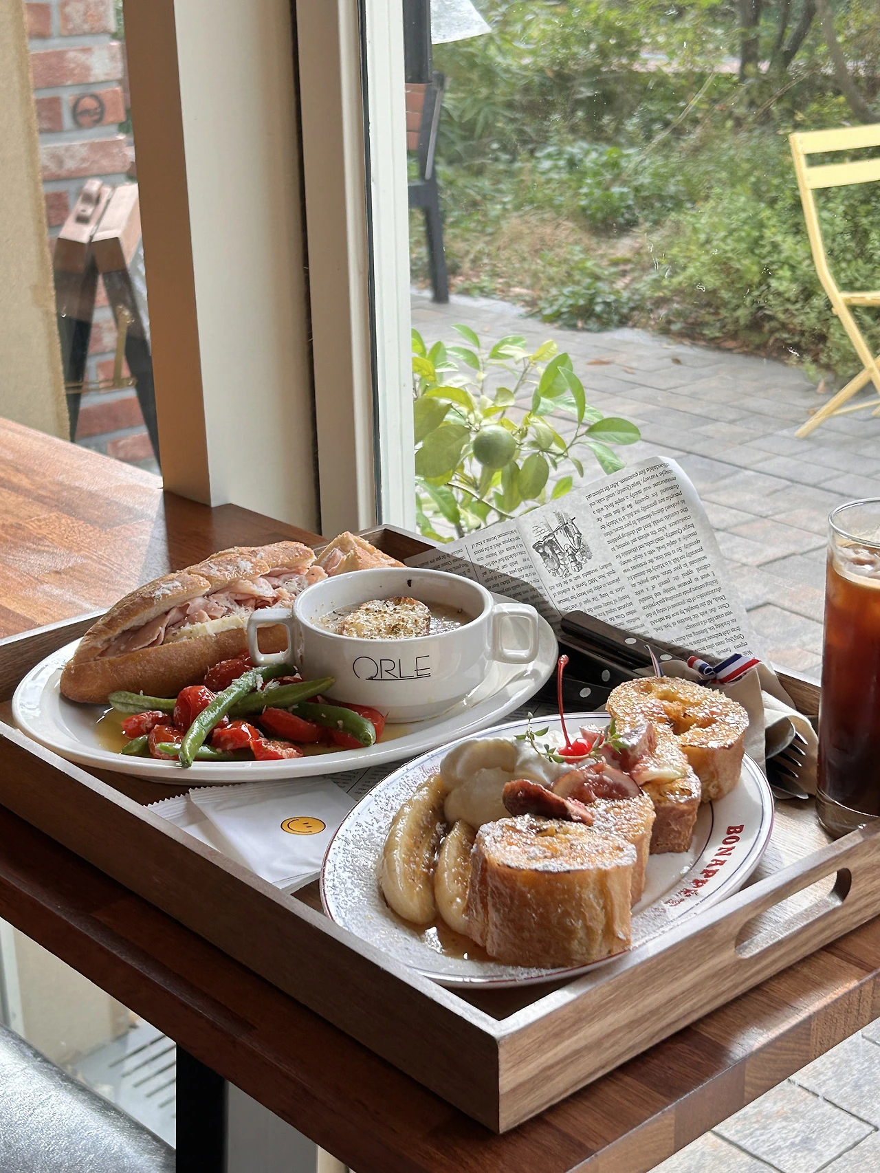 햇살이 따사롭게 스며드는 브런치 카페에 들어섰다. 노란 벽지가 햇빛을 받아 더욱 따뜻하게 빛났다. 잠시 눈을 감고 뜨니 프랑스의 작은 마을에 와 있는 듯한 착각이 들었다. 프렌치토스트와 스프, 잠봉뵈르 샌드위치까지. 분위기와 잘 어울리는 음식들이었다. 음식은 입에서 사르르 녹았고, 마음도 함께 녹아내렸다.