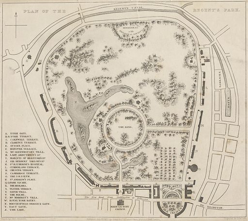 18세기 런던의 도로 및 광장의 그물망은 도시 중산층의 거주조건을 충족하기 위해 19세기 내내 확장되는 과정을 거쳤다. 그 결과 도로와 테라스가 딸린 주택 때문에 녹지광장이 띄엄띄엄 자리 잡게 되었다. 이런 공원의 규모와 조화(texture)에 불만족해서 등장한 것이 바로 정원사 험프리 렙턴이 설립한 영국 공원운동이다. 영국 공원운동은 녹화 전원단지(landscape country estate)를 계획, 렙턴과 존 내시가 공동으로 런던 리젠트 공원(The Regent's Park)을 설계했다. 영화 <101마리 달마시안>에서 남녀 주인공과 달마시안 두 마리가 처음 만나게 되는 바로 그 공원이다.