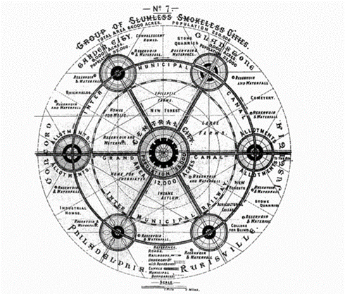 이미지 출처: https://www.researchgate.net/figure/Ebenezer-Howard-Garden-City-model-1898_fig1_307138728