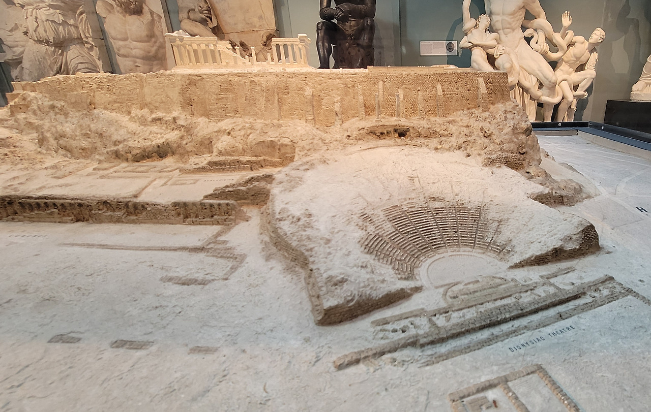 저 위에 신들이 거한다고 여긴 신전의 모습이 보인다. 광장(아고라)도 보이며 반원형의 극장도 보인다. 디오니소스 신을 찬양하는 축제인 디오니시아 축제가 열렸던 곳인 만큼 이곳은 원래 디오니소스 신에게 제사를 드리는 공간이었다고 보기도 한다. 오케스트라(현재 관현악단으로 우리가 알고 있는 오케스트라(Orkestra)는 당시 메인 스테이지였다.) 무대 중앙에 번제물을 드릴 수 있는 공간 있었으며 이 무대에서 행해졌던 각종 '극'들이 아마 제사의 한 형식이지 않았을까 보는 이들도 있다. 당시 관람객들이 앉아있던 곳은 테아트론(Theatron). (테아트론이라는 단어는 헬라어의 '본다'(테아오마이; 탐구하고 관찰하듯이 유심히 바라보는 행위)에서 유래했다고 한다.) 이곳에서 배우들과 '코러스'라는 인물들이 연기를 하였다. 스케네(Skene)라는 공간은 일종의 분장실, 백스테이지로 사용했을 것으로 추측이 된다.