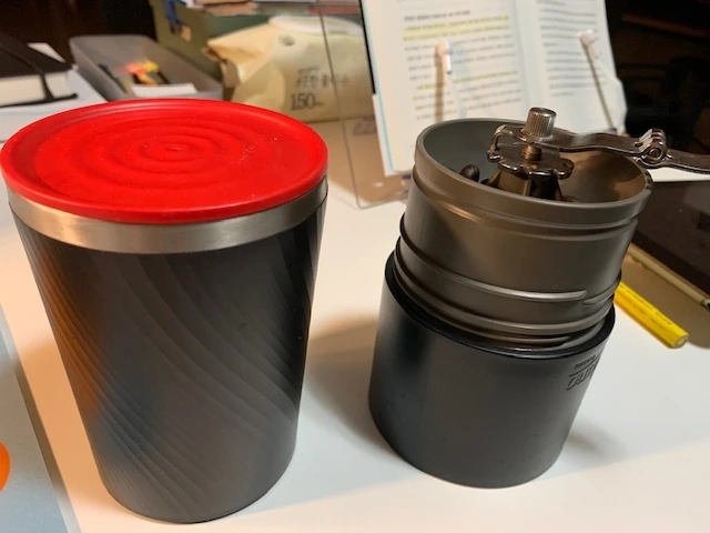 지금 이 사진처럼 뚜껑이 있어야 하는데 처음에 찾지 못했다. 이 커피메이커의 윗부분을 돌리면 이렇게 얇은 뚜껑이 생긴다. 뚜껑까지 바라지도 않았는데 횡재한 기분이었다. 뚜껑 자체가 컵 역할을 한다. 사진에는 보이지 않지만 아주 조그만 구멍이 있다. 커피를 갈고 나서 뜨거운 물을 따라 부을 때 사용하는 용도다. 집에서는 커피 포트에서 바로 물을 따라서 쓰다 보니 알지 못했다. 나중에 구멍을 발견했다. 알고 보니 용도가 있었던 것이다. 마지막 감동 포인트는 커피 메이커 밑바닥이다. 메이커 바닥 전체가 미끄러지지 않는 소재를 사용했다. 이건 당연한 건데! 바닥에 놓을 때 느낌이 '딱'이다.