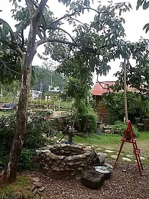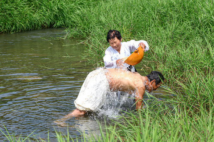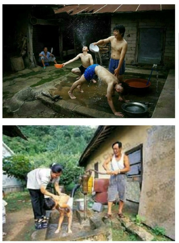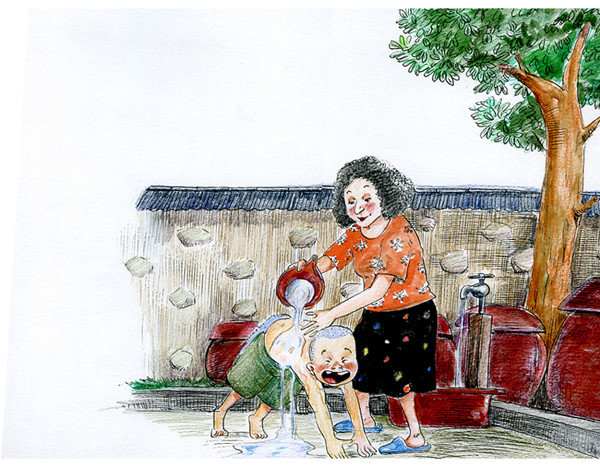 감나무 아래 샘터에서 목욕을 하고 계신다
