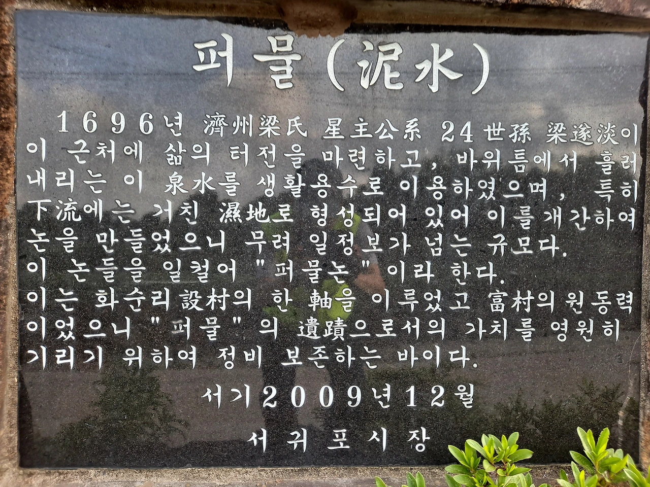 이 논들을 일컬어 퍼물논이라 한다. 이는 화순리 設村의 한 軸을 이루었고 富村의 원동력이었으니 퍼물의 遺蹟으로서의 가치를 영원히 기리기 위하여 정비 보존하는 바이다. 서기 2009년 12월 서귀포시장〉