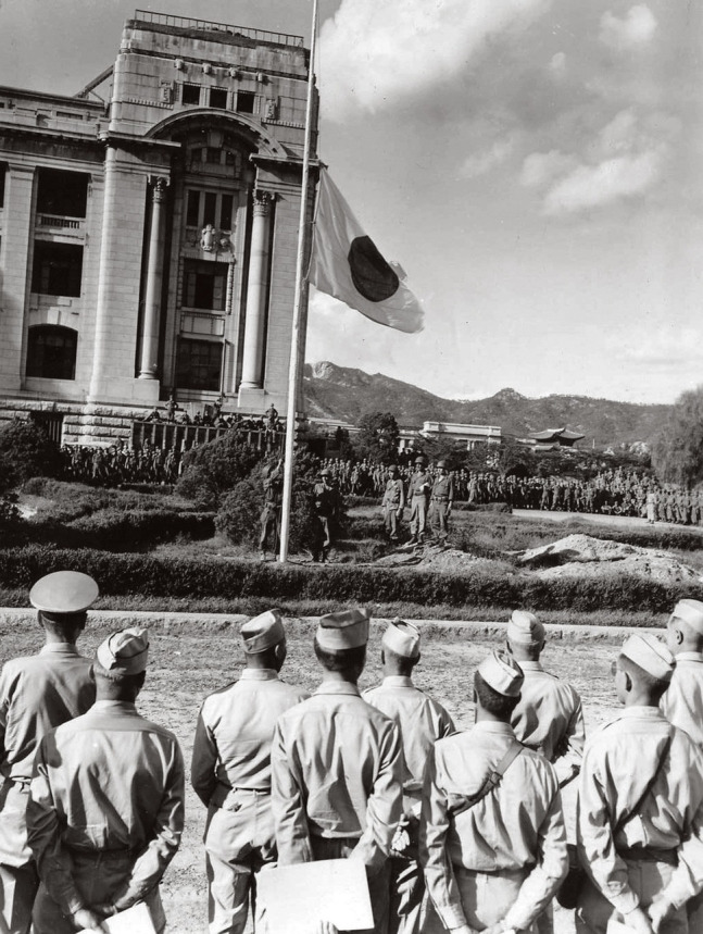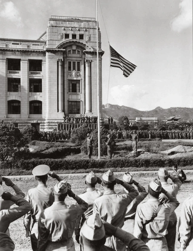 이 책에 실린 몇몇 중요한 사진들의 경우 미군정 3년사를 상징하는 매우 강한 이미지를 투사하였고, (…) 당시는 물론, 현재까지 우리의 인식이나 세계관에 큰 영향을 끼치게 되었다. 1945년 9월 9일 당시 조선총독부(1995년 8월 철거) 청사 앞 광장에서 한국에 진주한 미군들이 일장기를 끌어내리고 미국의 성조기를 게양하는 사진은 35년간의 일제 식민지 통치가 종언을 고하고, 새로 미군정이 시작되었다는 사실을 적나라하게 보여주고 있는 장면인 것이다. (사진 미 육군, 미국 국립문서기록보관청)