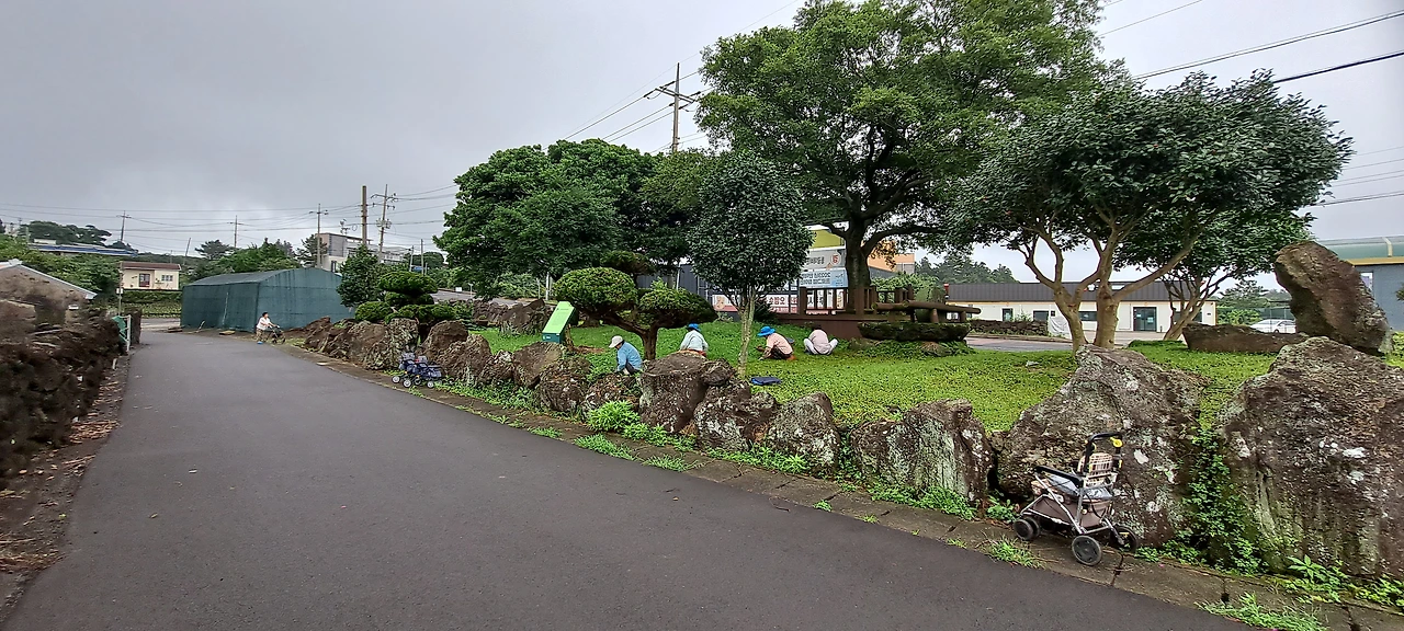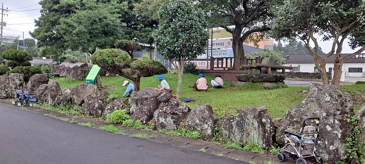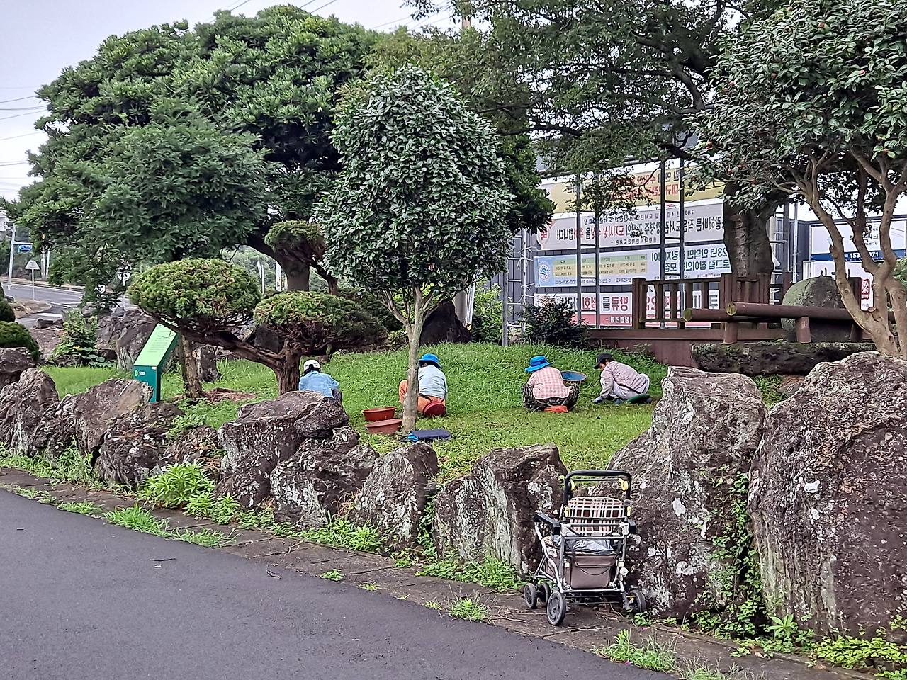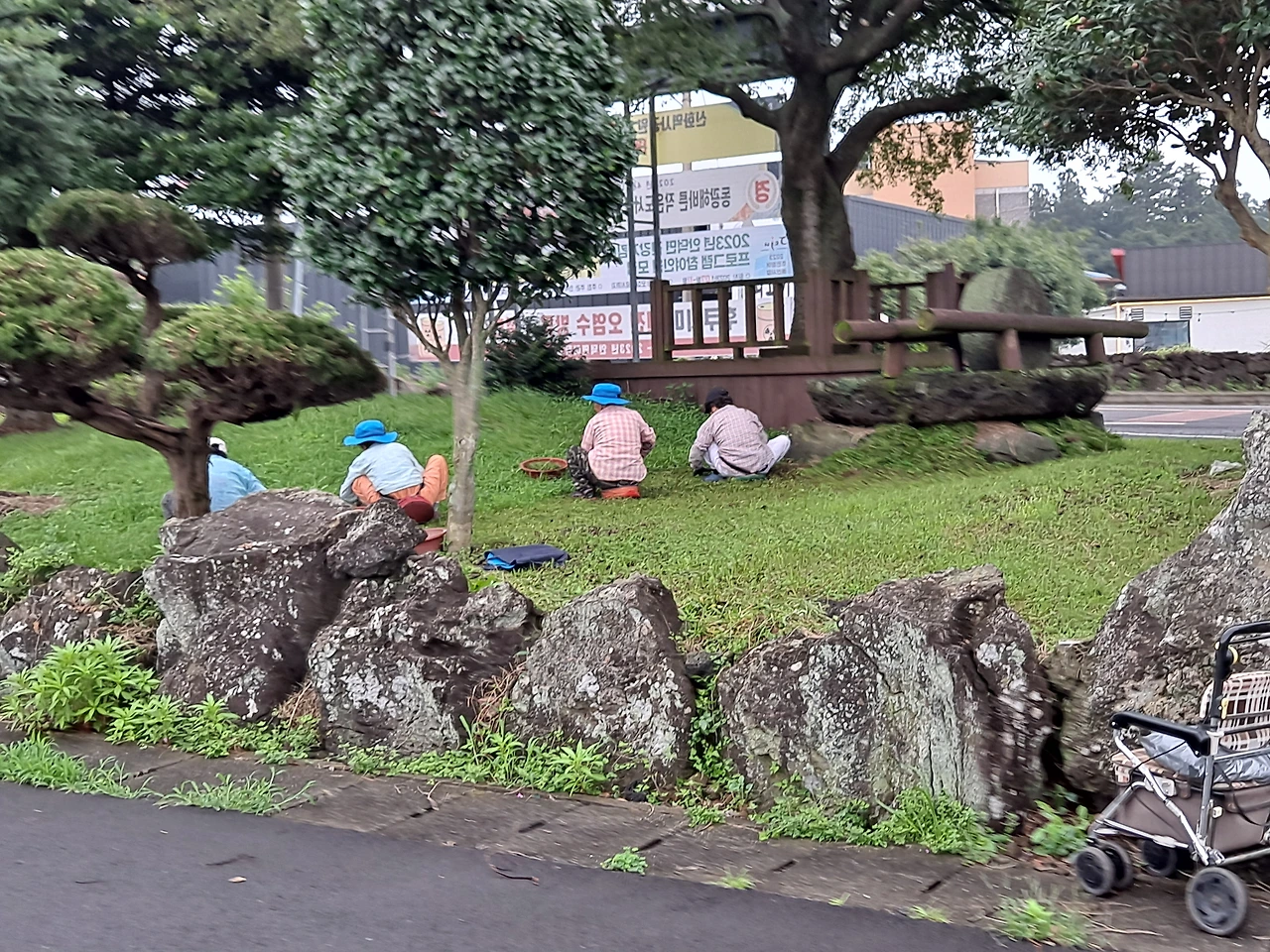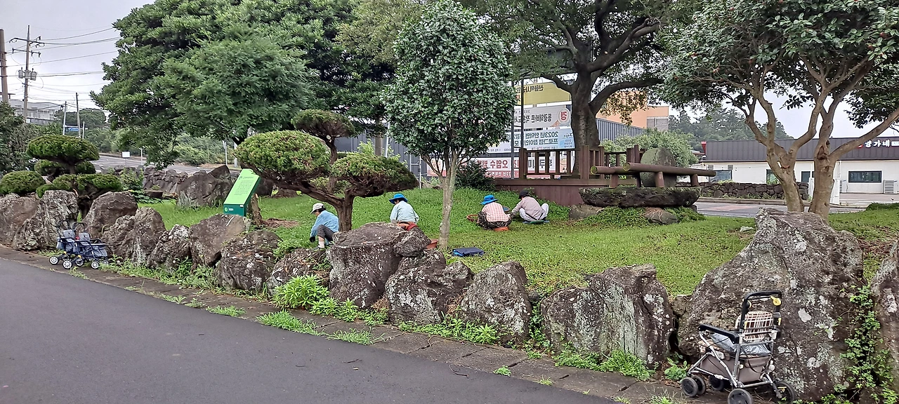 할머니유모차 세워두고 풀을 뽑기 시작한다