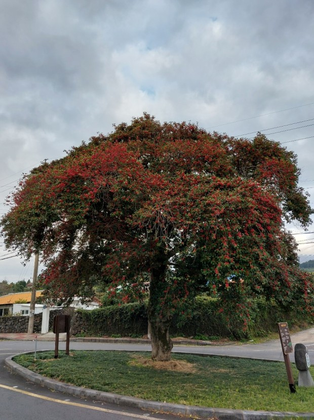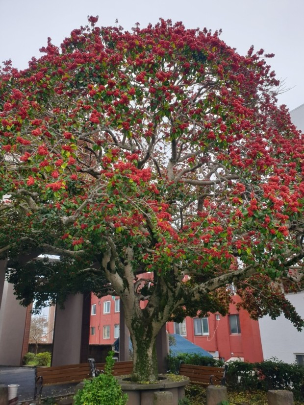 이중섭박물관 인근 자치경찰대 마당 남쪽 구석에는 마치 거대한 우산을 펼쳐놓은 같은 자태를 뽐내는 나무가 있다. 먼나무인데, 다른 나무의 방해 없이 독립수로 자라기 때문에 무척이나 화려한 수관을 뽐낸다.