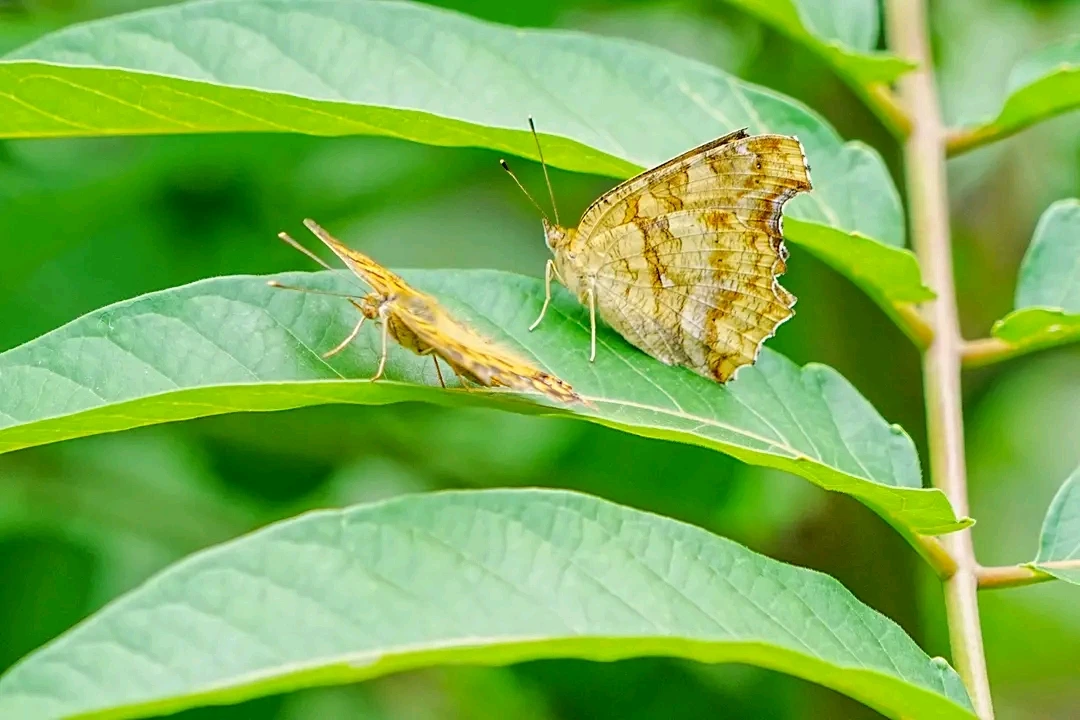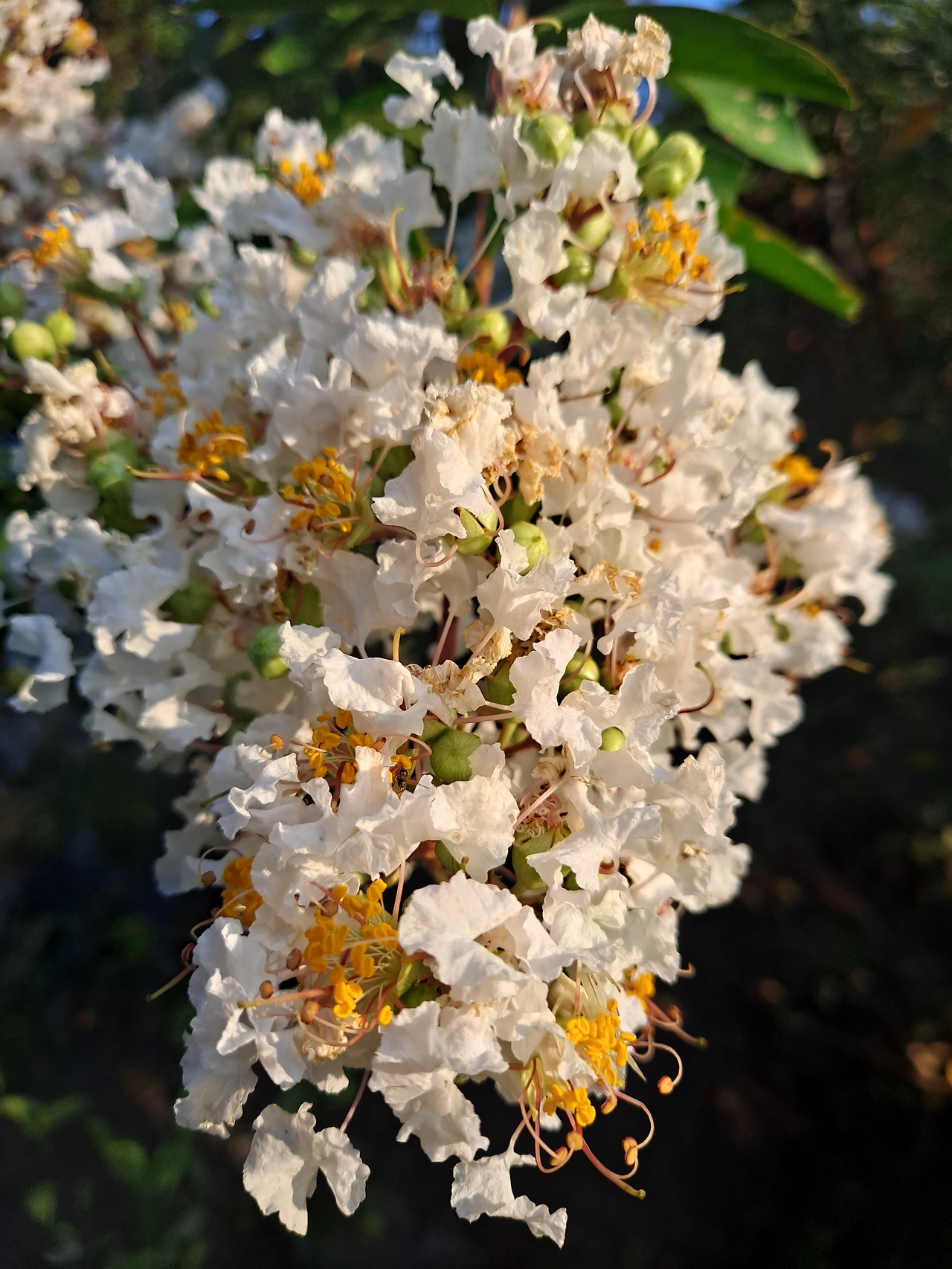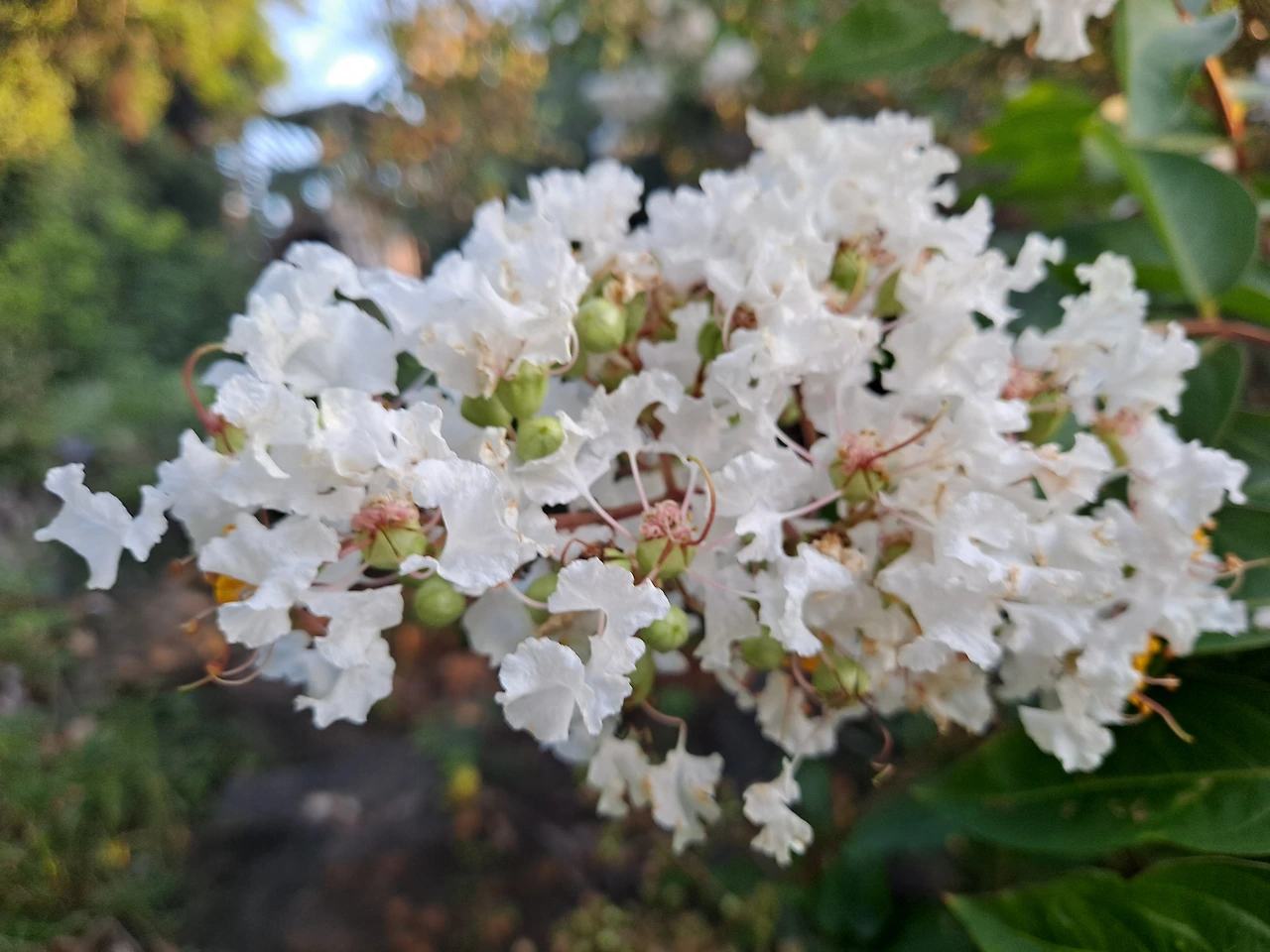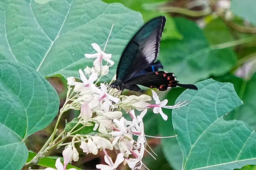 배롱나무의 분홍빛꽃과 하얀색꽃을 나비가 감싼다