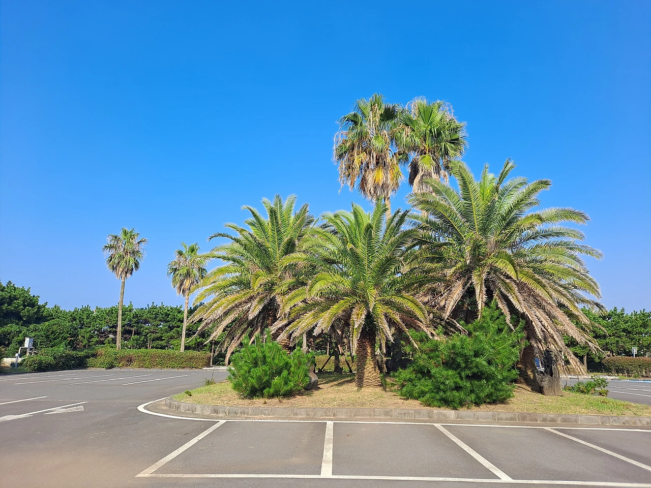 키 큰 워싱턴야자수를 카나리아야자수들이 감싸고