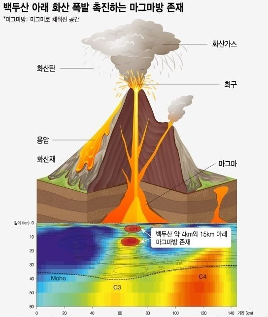 백두산 아래쪽 마그마 방에 마그마가 차오르고