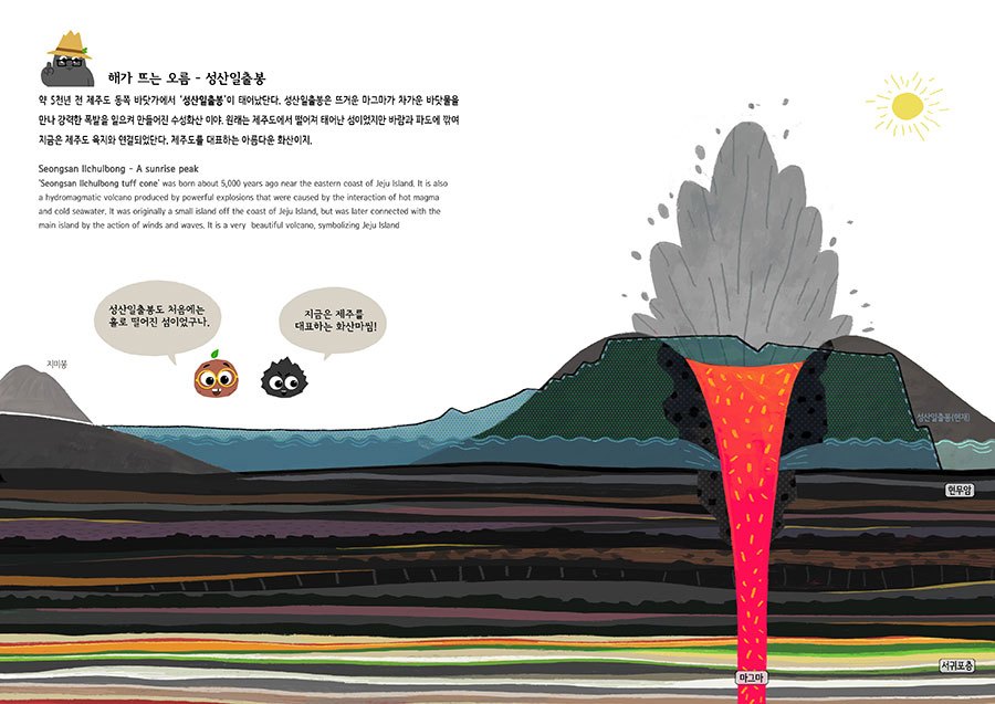 높이 180m의 성산일출봉은 약 5천 년 전 얕은 바다에서 일어난 수성화산 활동으로 형성된 응회구이다. 지하에서 올라온 뜨거운 마그마와 물이 만나 격렬하게 반응하면서 분출된 화산재가 쌓여 일출봉이 형성되었다. 바닷바람과 파도에 의한 침식작용으로 드러난 지층을 통해 화산폭발 당시 형성된 퇴적구조를 관찰할 수 있다.