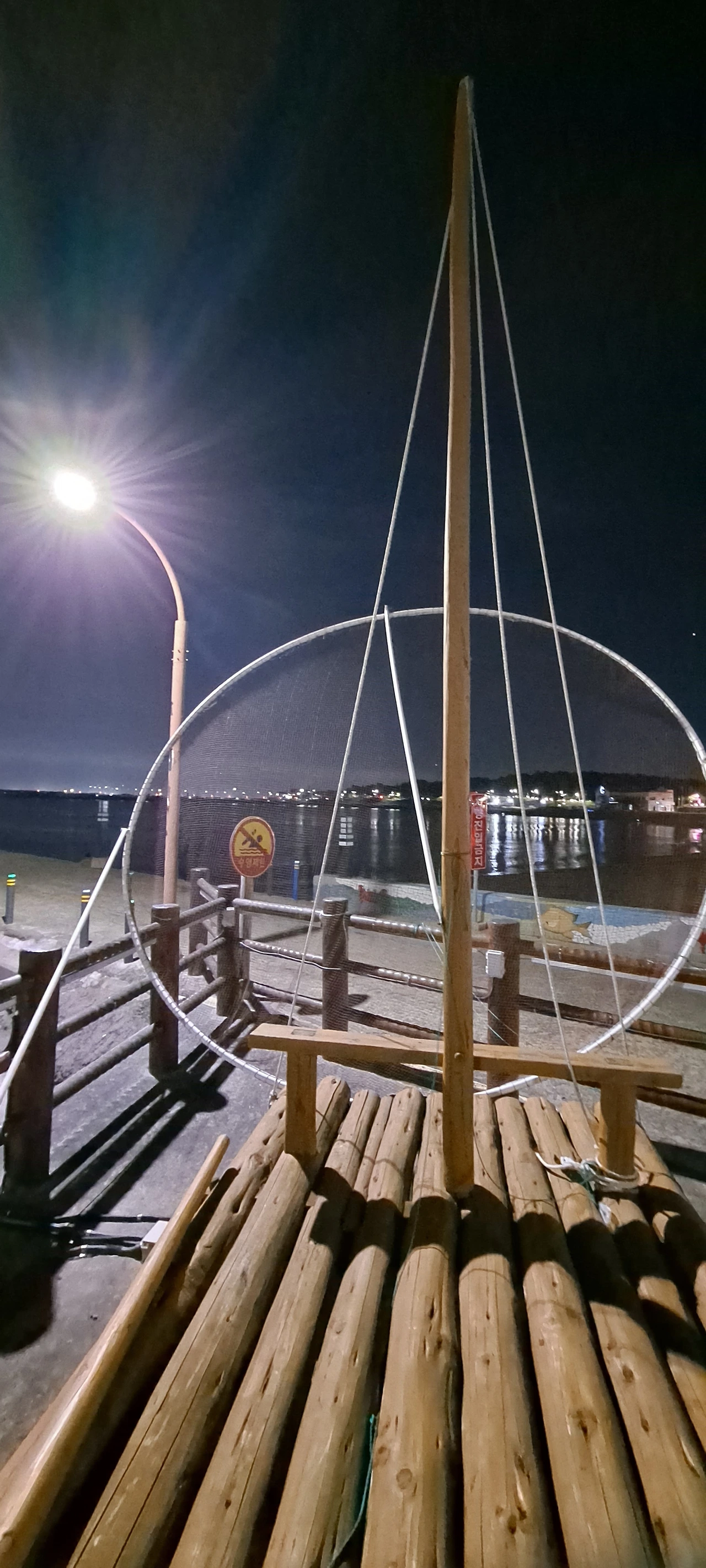 배에 불을 켜놓고 긴 줄을 바닥에서 감는다