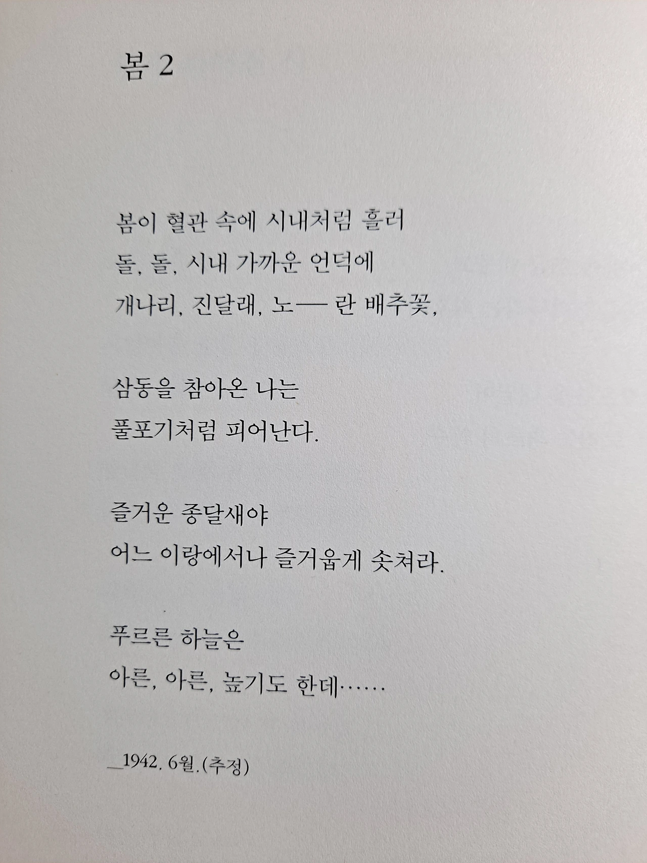 앞표지에 <봄>이 노랗게 피어있다. 윤동주 시인의 남은 작품 중에서 가장 나중에 쓰인 작품으로 알려져 있다. 1942년 6월에 쓴 것으로 추정하고 있으니 그 이후의 작품이 어딘가에 숨어있을 확률도 있다. 하지만 아직까지 우리들은 찾지 못했다. 1945년 2월 16일 오전 3시 36분, 후쿠오카 형무소에서 옥사했으니 아마도 어딘가에서 우리들의 손길을 기다리고 있을 수도 있을 것이다. 나의 혈관 속에도 윤동주의 피가 흐르고 있을까? 겨울이 이제 막 시작 되었으나 우리들에게는 또한 동지가 멀지 않았다. 동지가 멀지 않았다는 것은 우리들의 밤의 길이도 조금만 더 길어지면 정점을 찍고 다시 짧아질 것이다. 밤이 다시 짧아지고 낮이 길어지기 시작하면 우리들의 봄은 이미 시작되었다는 말이다. 자, 이제 우리들의 봄이 멀지 않았다. 봄이 오기 전에 나는 먼저 참회록을 써야만 한다.