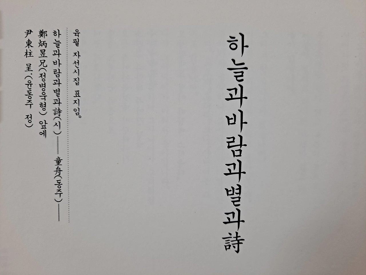 윤동주 시인이 직접 쓴 육필 원고에는 시집 제목 <<하늘과 바람과 별과 시>> 아래 童舟(동주)라는 글씨가 있다. 우리가 흔히 알고 있는 東柱(동주)가 아니라 童舟(동주)라고 썼다. 윤동주의 본명은 윤동주(尹東柱)이지만 작품을 발표할 때는 주로 필명을 쓰는 경우가 많았다. 童舟, 童柱, 東柱..., 이 중에서 윤동주가 살아서 <<하늘과 바람과 별과 시>>를 발행했다면 어쩌면 童舟라는 이름으로 발행하지 않았을까 생각해 본다. 이육사도 다양하게 '육사'라는 이름을 변주하여 사용했는데, 윤동주 역시 자신의 이름에 대하여 많은 생각을 했을 것이다. 참고로 윤동주의 아호는 해환(海煥)이었다.