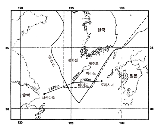 동중국해는 한․중․일 3국의 EEZ와 대륙붕이 중첩되는 수역으로 해양경계 획정에 어려움을 겪고 있는 바다다. 동중국해 상에 위치한 이어도는 해수면에서 4.6m 이래에 있는 수중 암초로 한․중 간 EEZ 획정에서 첨예하게 대립되는 이슈다. 이어도를 사이에 두고 한․중 양국 해안선까지의 거리가 400해리가 되지 않기 때문이다. 그런데 이어도는 한․중 양국의 EEZ가 겹치는 지점에 위치해 있지만, 한국 쪽으로 28해리 가깝게 위치해 있고 일반적인 획정 원칙인 ‘중간선 원칙’을 적용하면 당연히 한국의 관할 영역에 속한다.