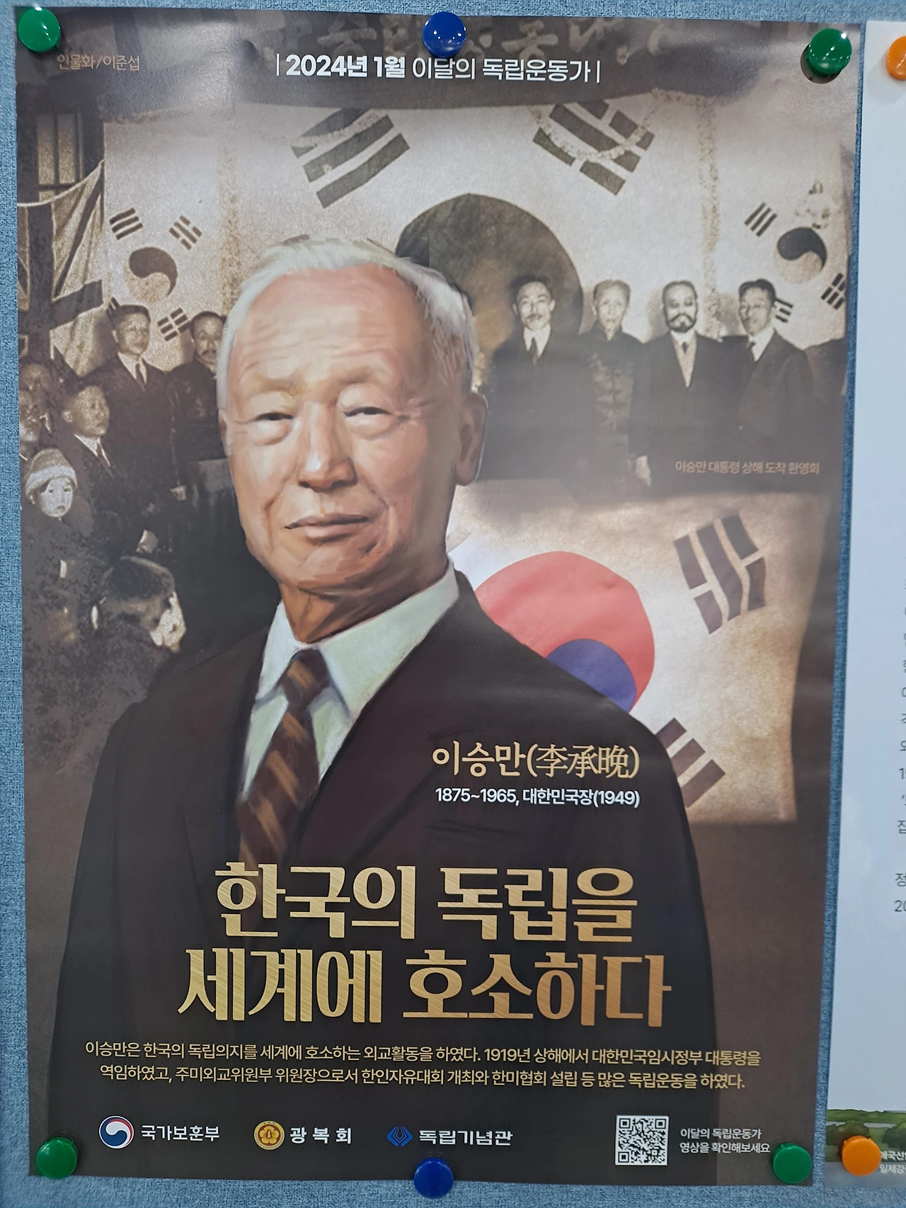 2024년 1월, 이달의 독립운동가 이승만은 많은 사람들이 알고 있을 것이다. 특히 제주도 사람들은 더 잘 알고 있을 것이다. 미군정과 이승만 정권 때 너무 많은 제주도 사람들이 죽었기 때문에 잘 알고 있을 것이다. 그가 한 말들 중에 유명한 말이 "뭉치면 살고 흩어지면 죽는다"라는 말일 것이다. 어쩌면 그는 말과 행동이 달랐던 사람이 아닐까 의심스럽다. 그는 어쩌면 남한과 북한을 하나로 묶으려고 노력하지 않고 남한과 북한을 흩어지게 한 장본인이 아닐까? 자신이 대통령이 되기 위하여, 자신의 권력욕을 채우기 위하여 너무나 많은 사람들을 죽음으로 몰아넣은 것은 아닐까? 이승만에 대한 공부가 더 많이 필요할 것 같다.