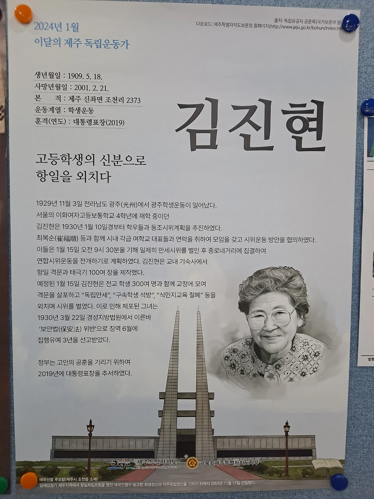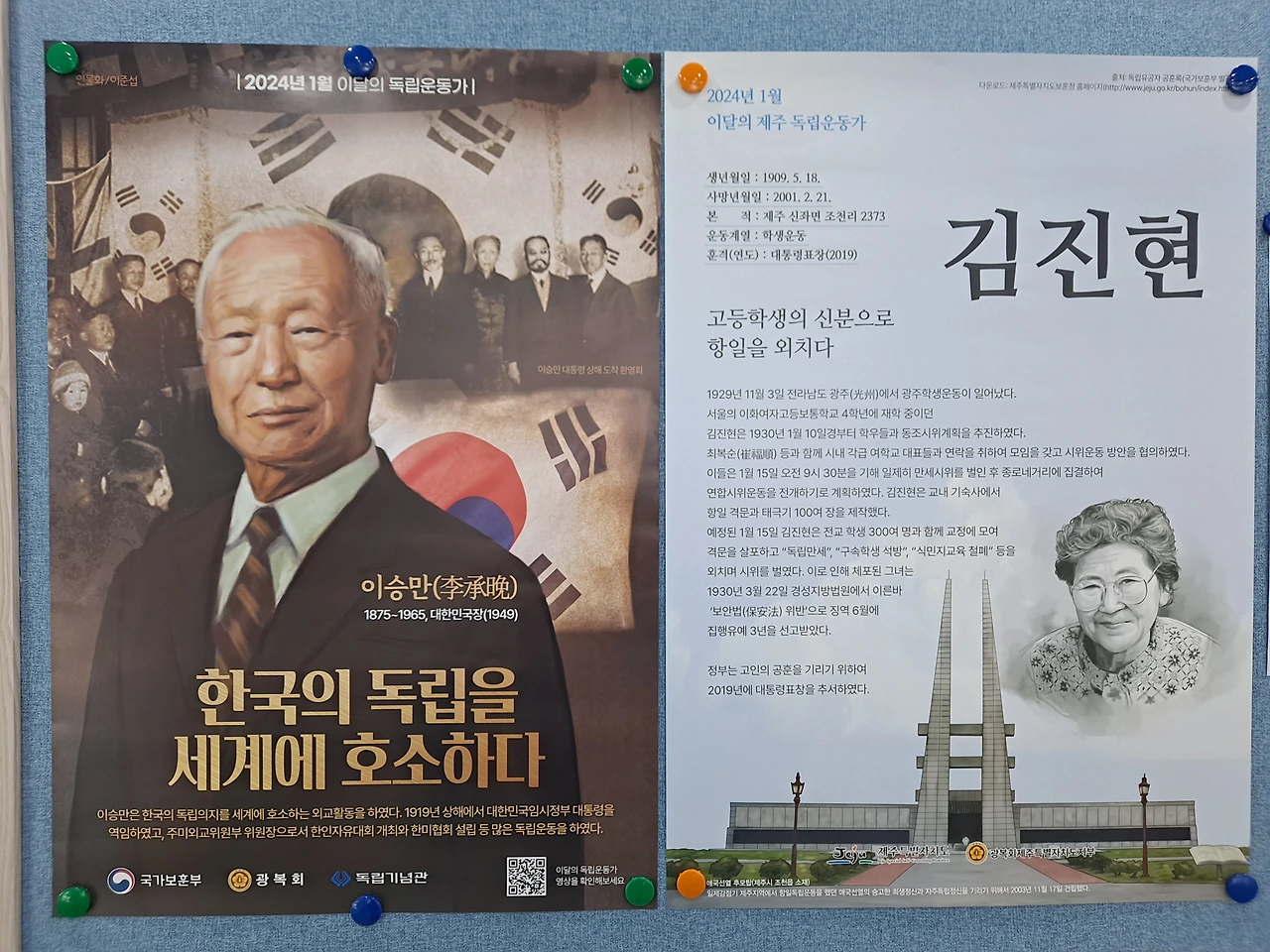 윤동주 시인과 함께 도서관에 갔다. 문을 열고 들어서니 포스터 두 장이 나란히 붙어 있다. 이달의 독립운동가 이승만, 제주의 독립운동가 김진현, 두 분이 우리를 맞이한다. 마음이 무겁다. 그림자는 더욱 무겁다. 그림자가 벽을 짚고 겨우 일어선다. 모든 죽어가는 것을 사랑했던, 윤동주 시인이 나를 부른다. 솔직하게 말하면 제주의 독립운동가 김진현 선생님은 잘 모르는 분이다. 고등학생 신분으로 항일을 외치다 징역 6월에 집행유예 3년을 선고받았다고 한다. 항일 격문과 태극기 100여 장을 제작했고 전교 학생 300여 명과 함께 독립만세, 구속학생 석방, 식민지 교육 철폐 등을 외치며 시위를 벌였다고 한다. 그때나 지금이나 '보안법'이 문제다.