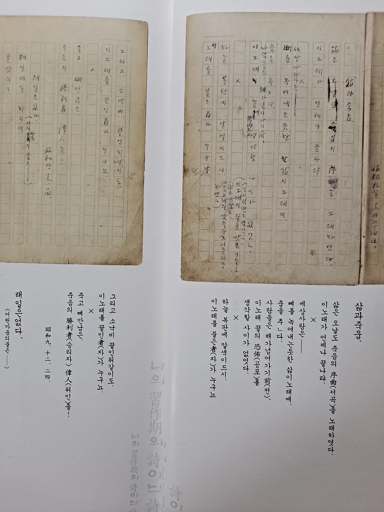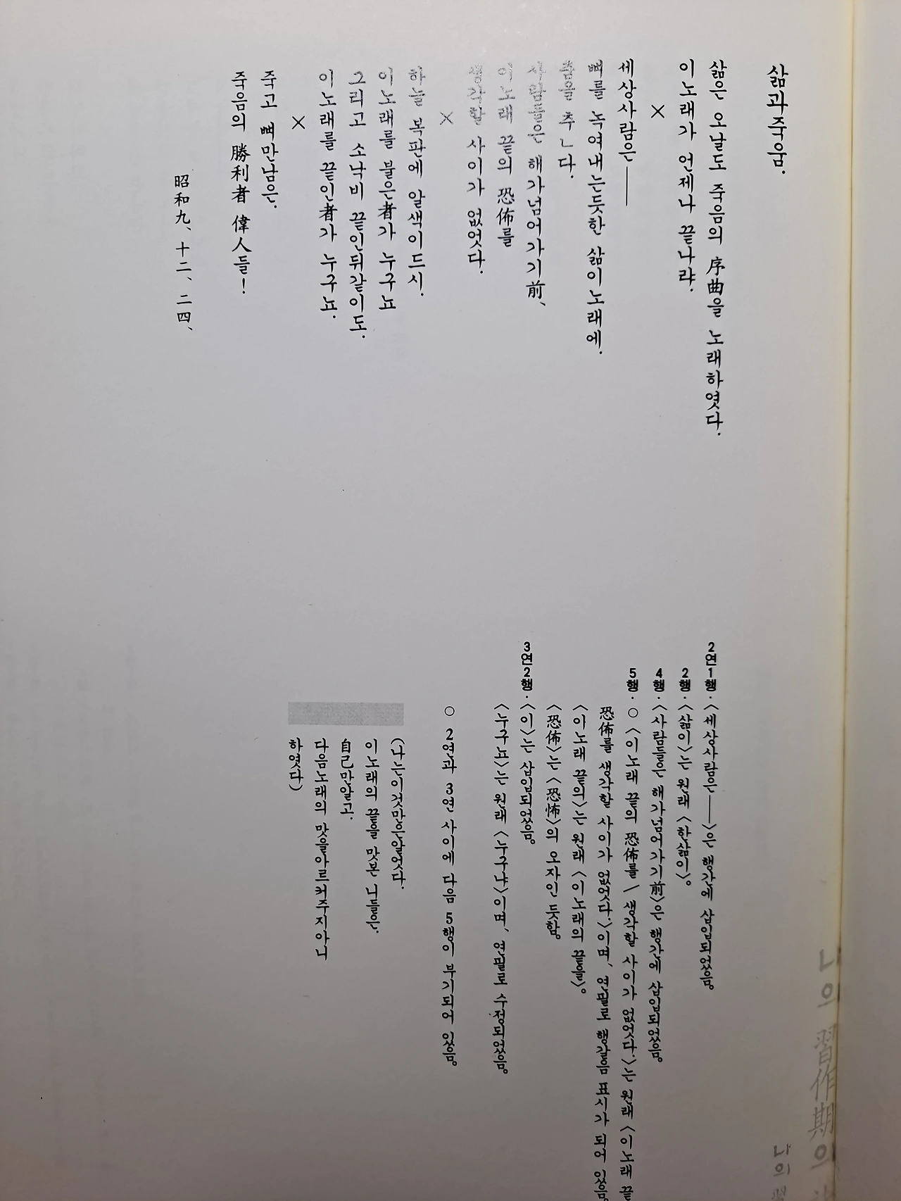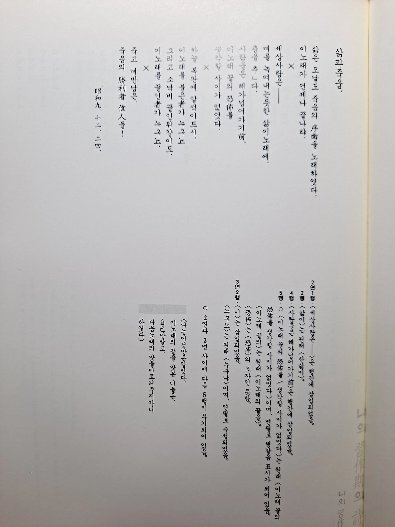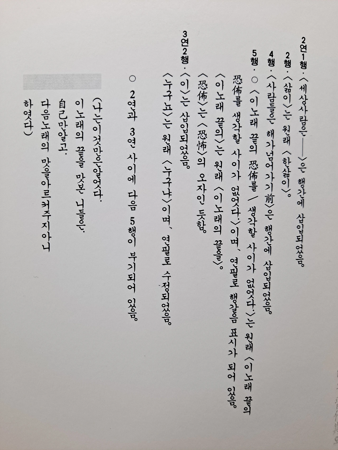 이 시는 판본마다 연 구분이 조금씩 다르게 되어 있다. 나는 가능한 윤동주 시인의 자필 원고에 가깝게 해석하고 싶다. 그런데 자필 원고에는 수정한 표시와 함께 추가된 메모도 함께 있다. 2연과 3연 사이에는 다음과 같은 5행이 부기되어 있기도 하다.