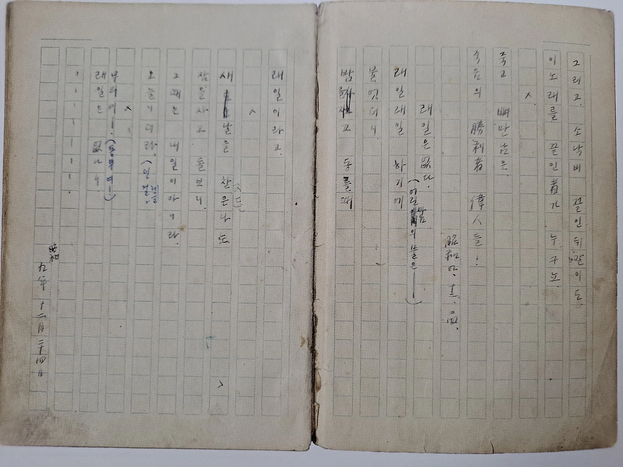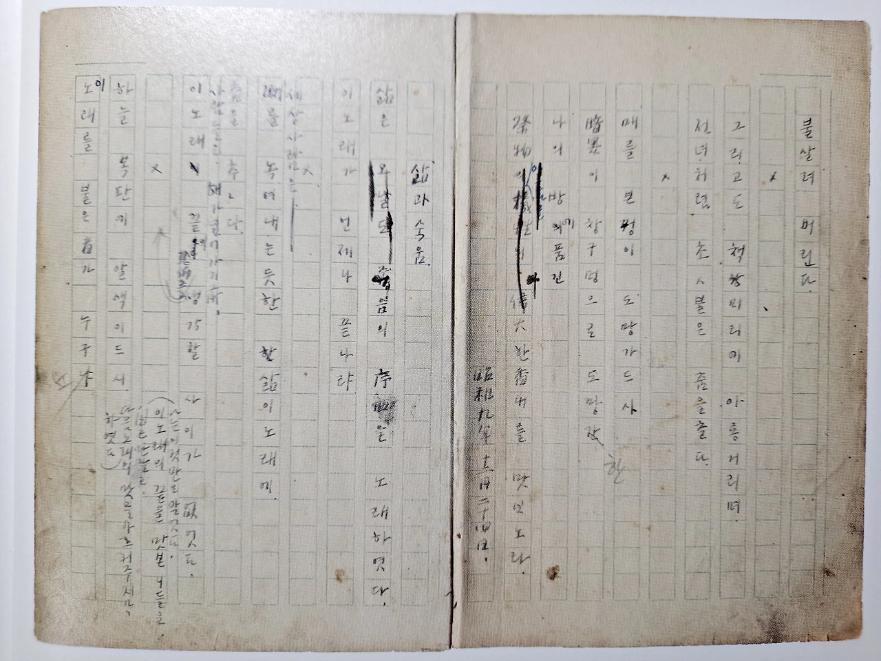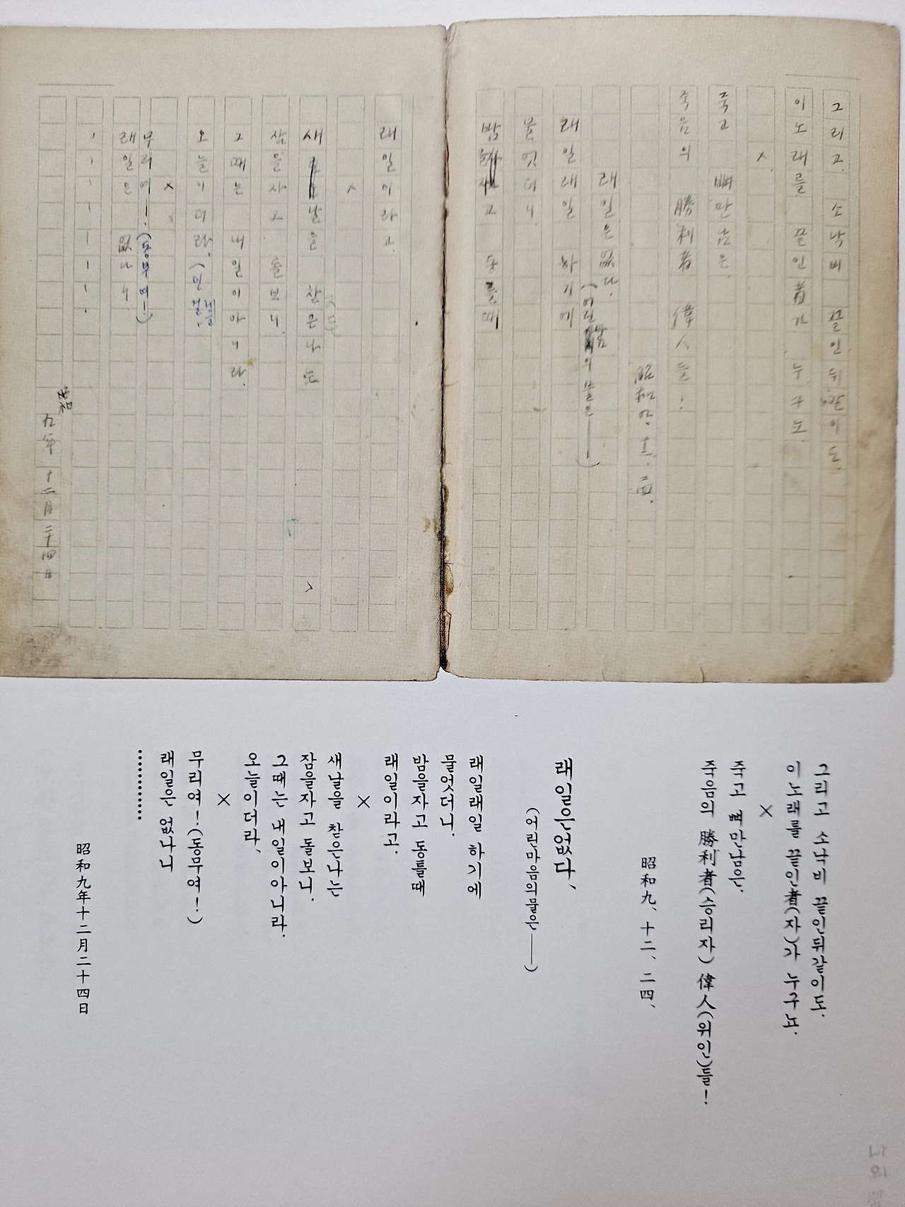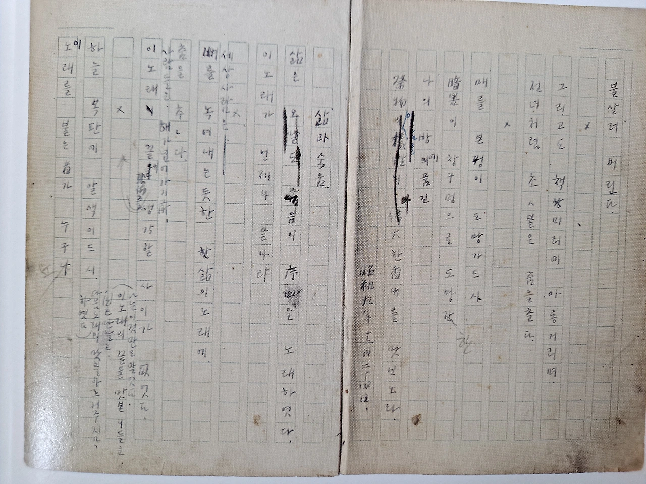 이 시는 판본마다 연 구분이 조금씩 다르게 되어 있다. 나는 가능한 윤동주 시인의 자필 원고에 가깝게 해석하고 싶다. 그런데 자필 원고에는 수정한 표시와 함께 추가된 메모도 함께 있다. 2연과 3연 사이에는 다음과 같은 5행이 부기되어 있기도 하다.