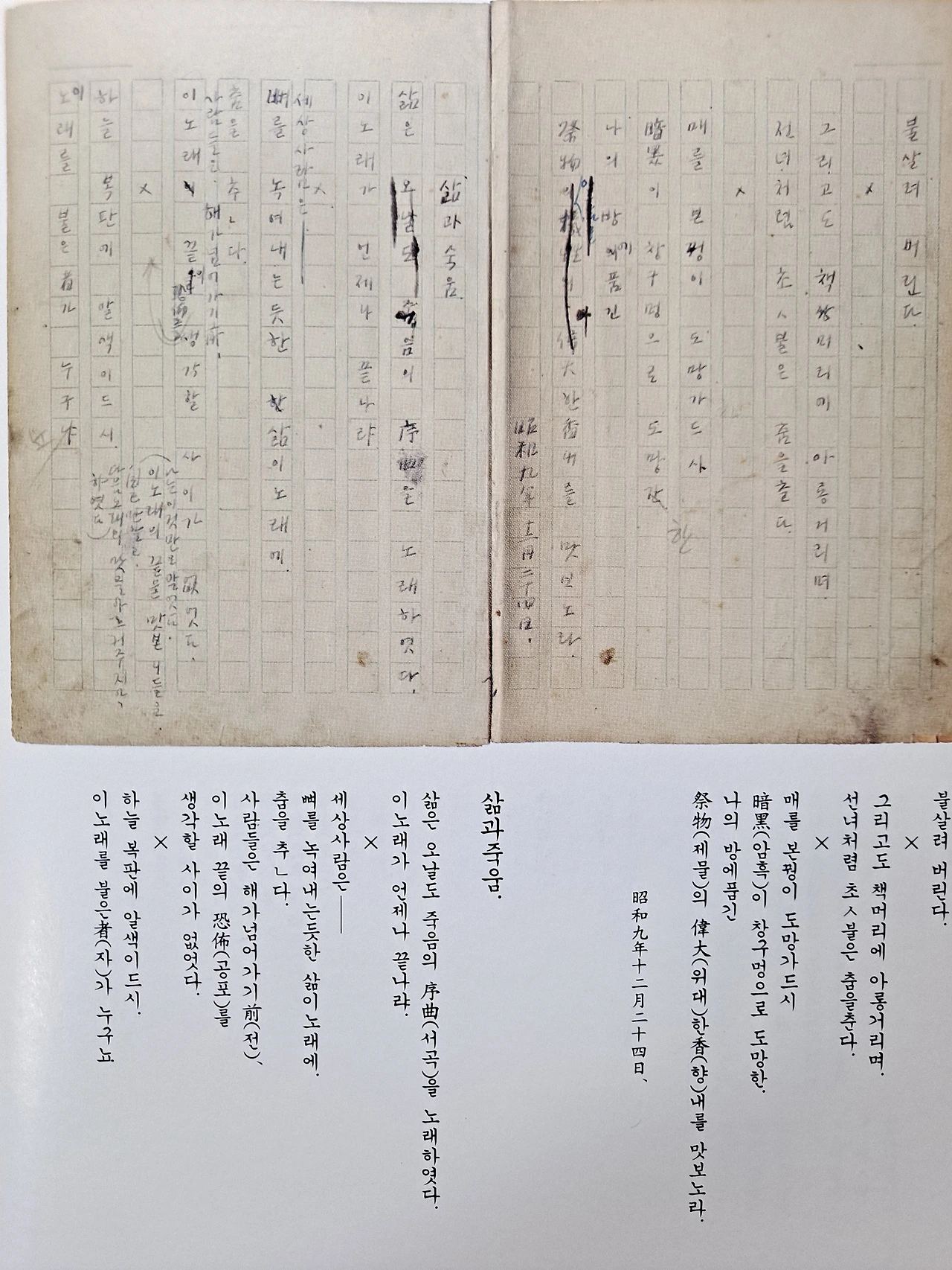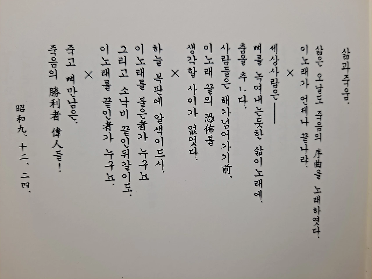 자, 그럼 이제 윤동주 시인의 <삶과 죽음>을 살마리 삼아서 우리들의 삶과 죽음에 대하여 생각을 해보자. 좋은 시는 우리들에게 한 번쯤 자신을 진지하게 돌아보게 할 수 있어야 좋은 시일 것이다. 또한 좋은 시는 그 시를 읽고 자신들의 삶을 깊이 들여다보고 자신들에 맞는 또 다른 시를 쓰게 만들 수 있는 시가 좋은 시일 것이다. 따라서 이 시 자체가 스스로 완벽하게 좋은 시가 아니더라도 더 좋은 시를 쓸 수 있는 단초를 제공해 줄 수 있으면 독자에 의해서 더 좋은 시로 재탄생할 수도 있을 것이다. 시는 그런 오묘한 장르여서 더욱 매력이 있는 것인지도 모른다.