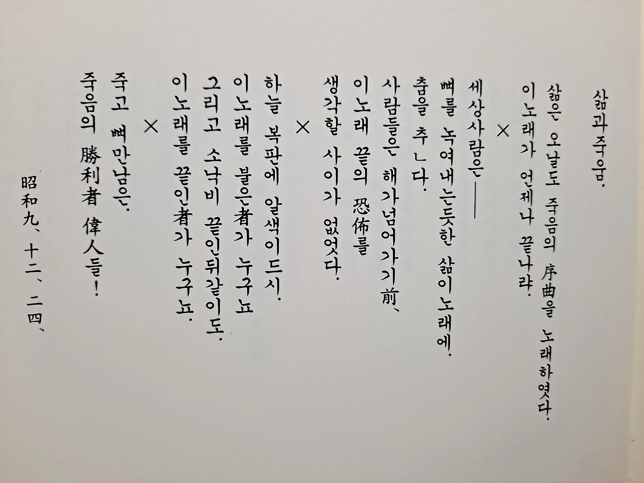 사람들은 해가 넘어가기 전에는 어둠을 알 수 없다. 밤을 알 수 없다. 죽음의 서곡이 끝나면 어떤 노래를 불러야만 할지 아직은 알 수가 없다. 이 노래 끝의 공포를 체험할 수 없다. 하지만 이 또한 너무 염려할 필요는 없다. 오늘을 잘 사는 것이 오늘을 잘 죽는 일일 것이다. 또한 오늘을 잘 죽는 일이 오늘을 잘 사는 일일 것이다. 윤동주 시인의 <삶과 죽음>의 시에서 "하늘 복판에 알 새기듯이"라는 표현이 참 재미있다. 하늘 복판에 알을 새긴다는 말은 무슨 뜻일까? 하늘 복판에 알 새기듯이 노래를 부른 자는 또한 누구일까? 그리고 소낙비 그친 뒤 같이 노래를 그친 자는 또한 누구일까? 알을 낳는 것도 아니고 알을 새기는 자는 누구일까? 그렇다면 나는 노래를 부르는 자일까 노래를 그친 자일까. 그렇다면 당신은 지금 노래를 부르는 자일까 노래를 그친 자일까. 우리들은 아직 삶이 끝나지 않았고 죽음의 서곡 또한 끝나지 않았을 것이다.