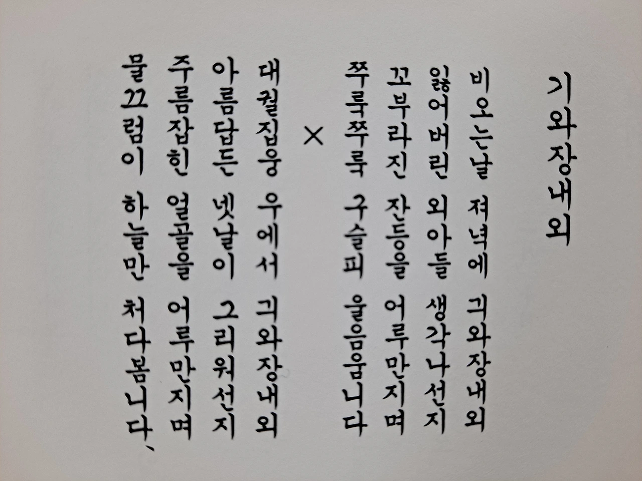 그러므로 나로서는 도저히 쓸 수 없는, 이렇게 따뜻하게 잘 쓴 이 시가 좋은 이유는 단순히 기와를 내외로 의인화에 그치지 않고 외아들을 잃은 서민들의 부부와 대궐에서 살았던 권력자의 삶을 은유적으로 표현한 것이 참으로 놀랍다.