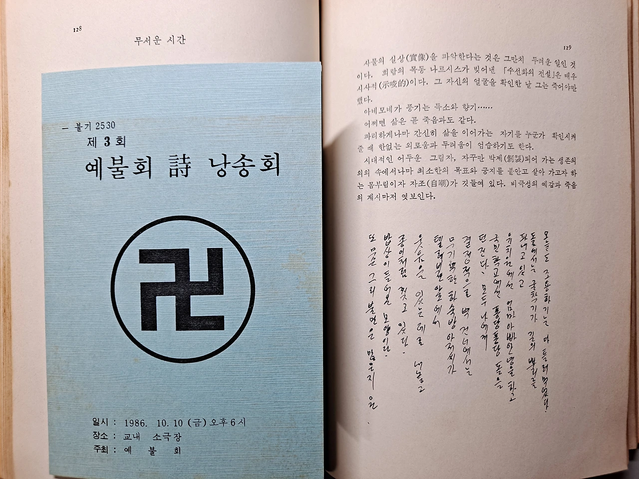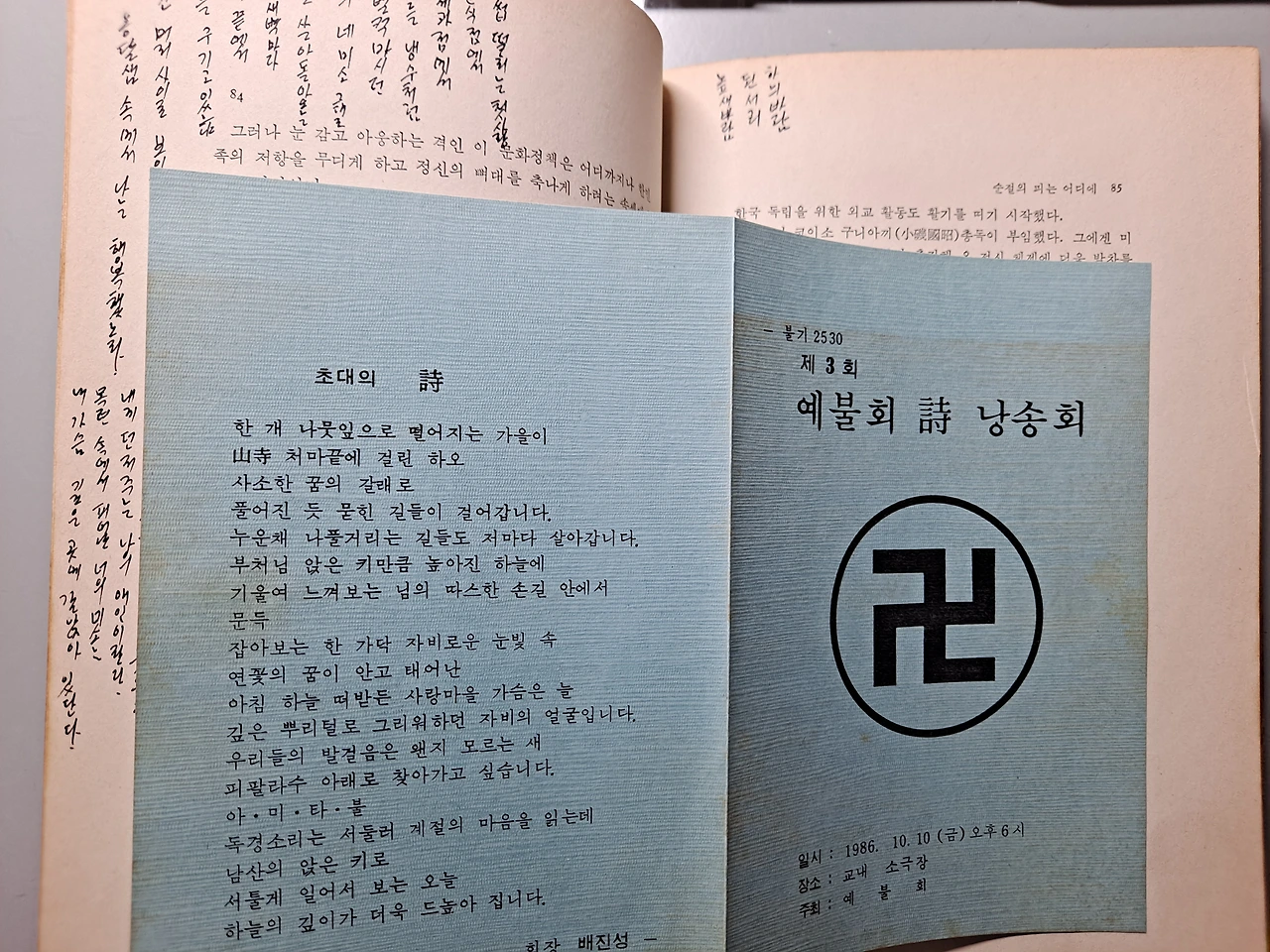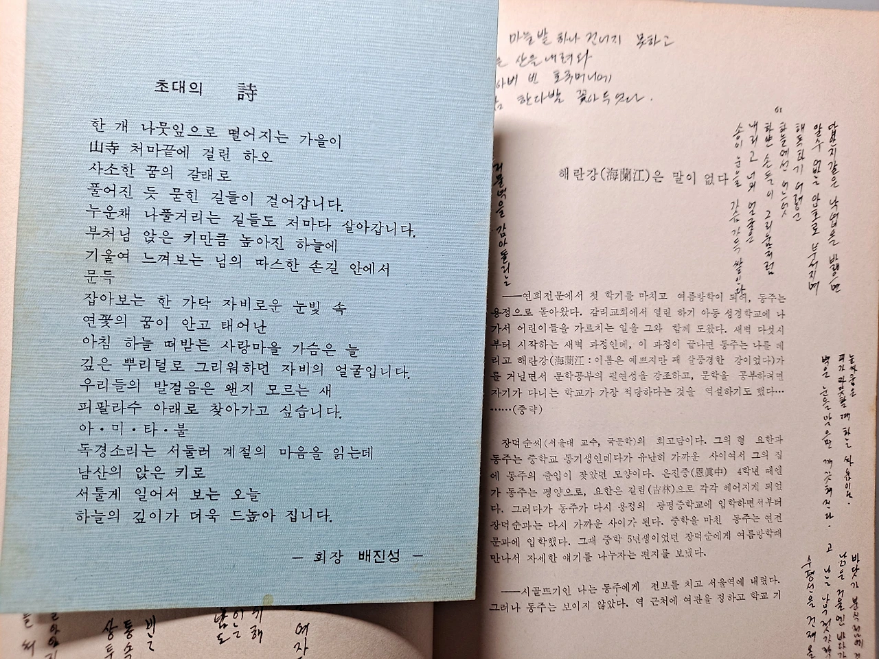 내가 대학 1학년때 읽었던 윤동주 시집을 다시 펼쳐든다. 그 시집에 낙엽 같은 종이 한 장이 들어있다. 시 낭송회 초대장 한 장 들어있다. 최인훈 교수님, 이근배 교수님, 지웅 스님, 진관 스님, 서춘 스님, 김성 친구, 김진우 친구 그리고....., 그리고 책 여백에 썼던 낙서들....., 나는 참 미쳐서 살았던 시절이 있었다. 그리고,