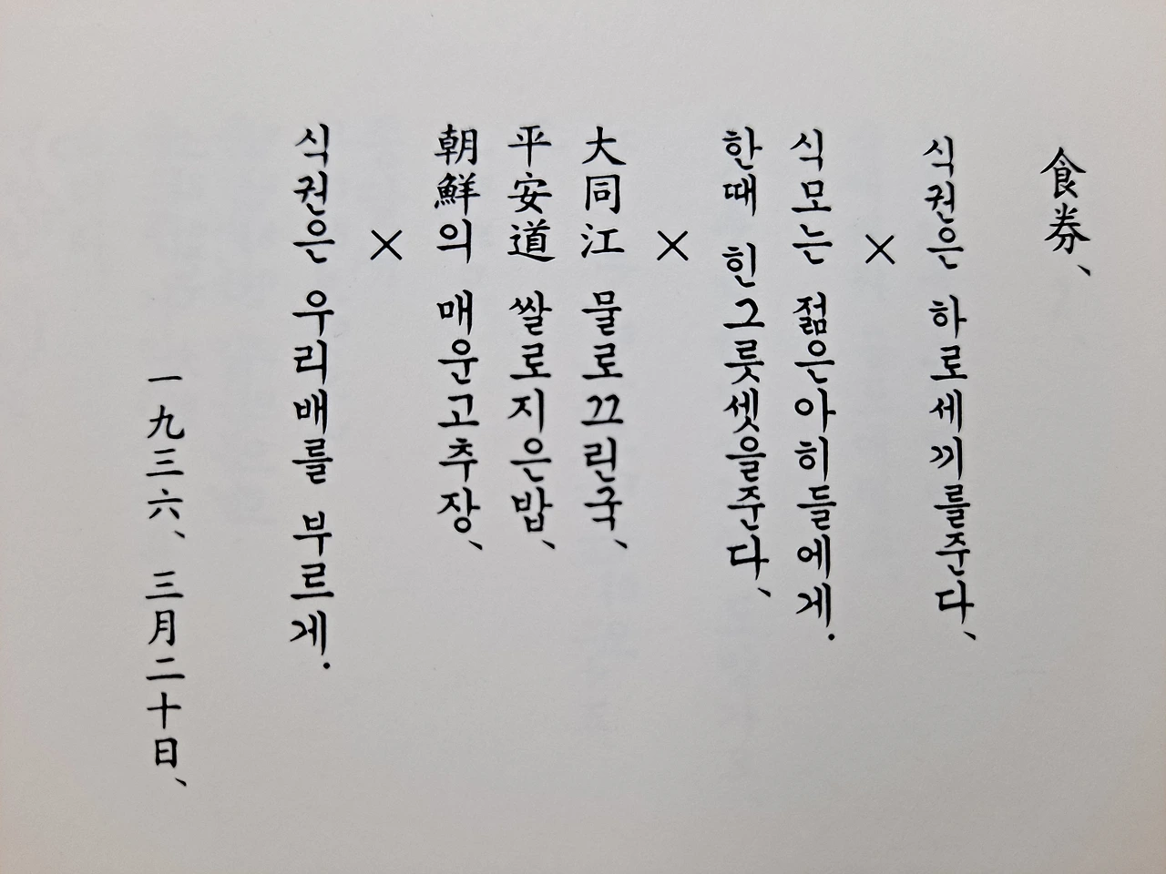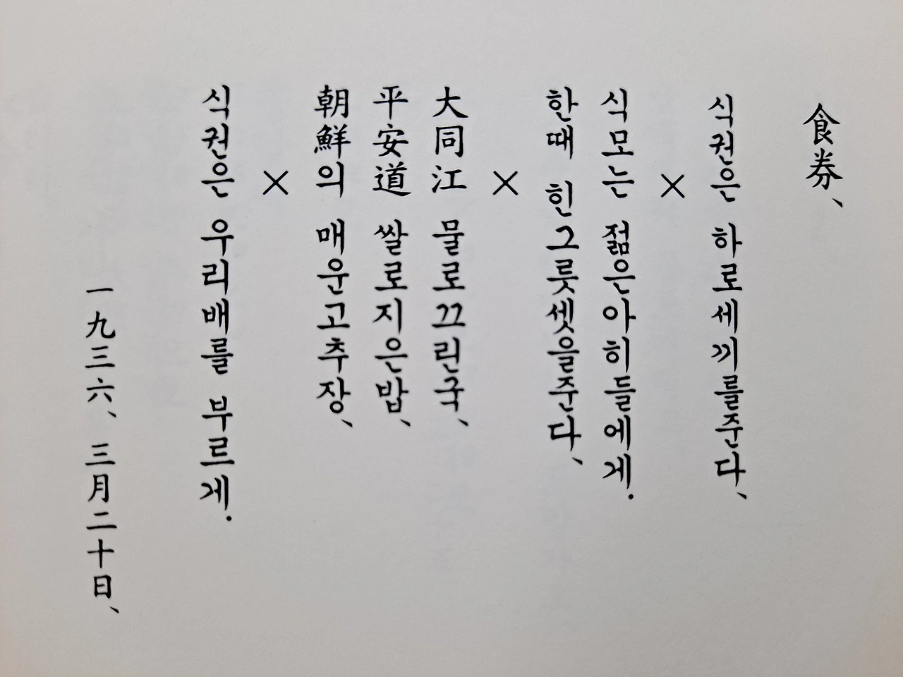 단체생활이나 조직생활에서 보게 되는 식권은 식생활 해결의 열쇠다. 이를 통해서 단체생활의 질서나 집단의 미학까지를 짐작하게 된다. 세끼의 밥은 포만감각과 함께 생의 리듬을 드러내 준다. 욕망 가운데 배 부르게 먹는 것보다 귀중한 것은 없다. 대동강 물로 끓인 국도 있고 평안도 쌀로 지은 밥도 맛볼 수가 있으며 조선의 매운 고추장에 한결 입맛을 돋우기도 하는 식권의 효용..., 관념적인 여러 가지 고민의 형태 보다 구체적이고 직접적인 본능적 욕망에 비중을 둔 것으로 보이는 이 시를 통하여 교회나 학교 등 소박한 단체생활의 한 단면이 엿보이기도 한다.