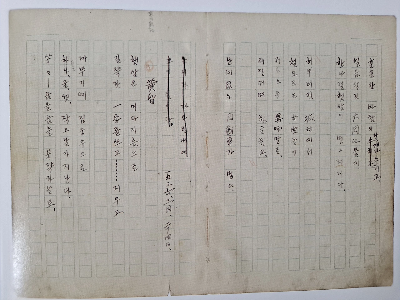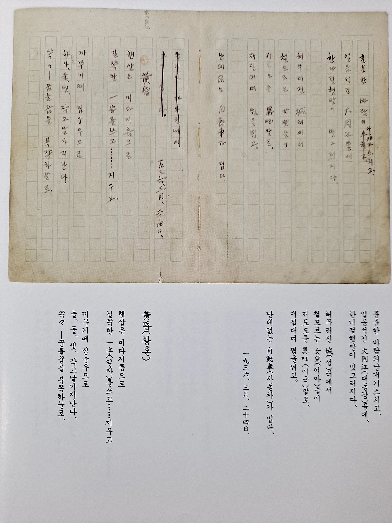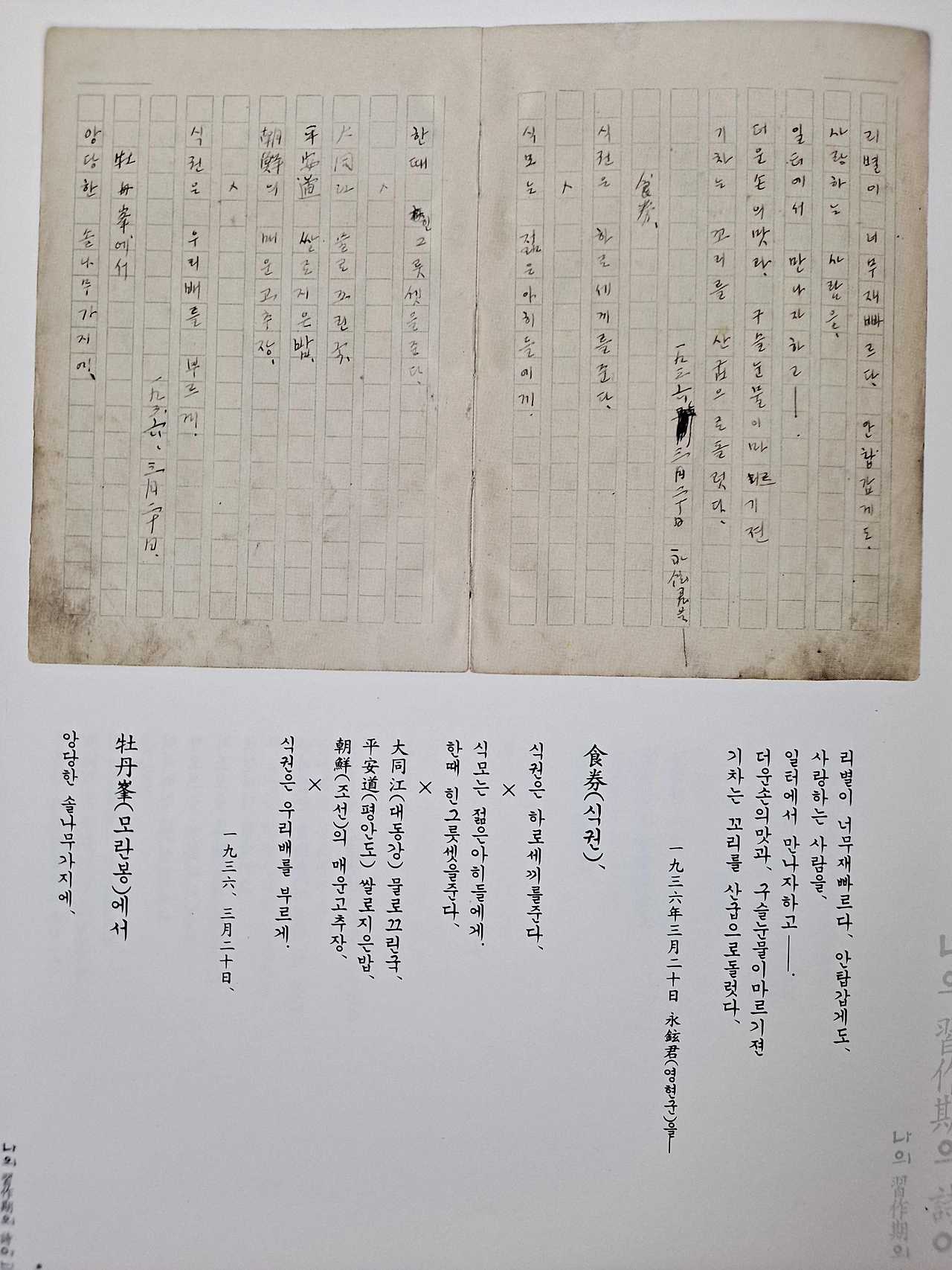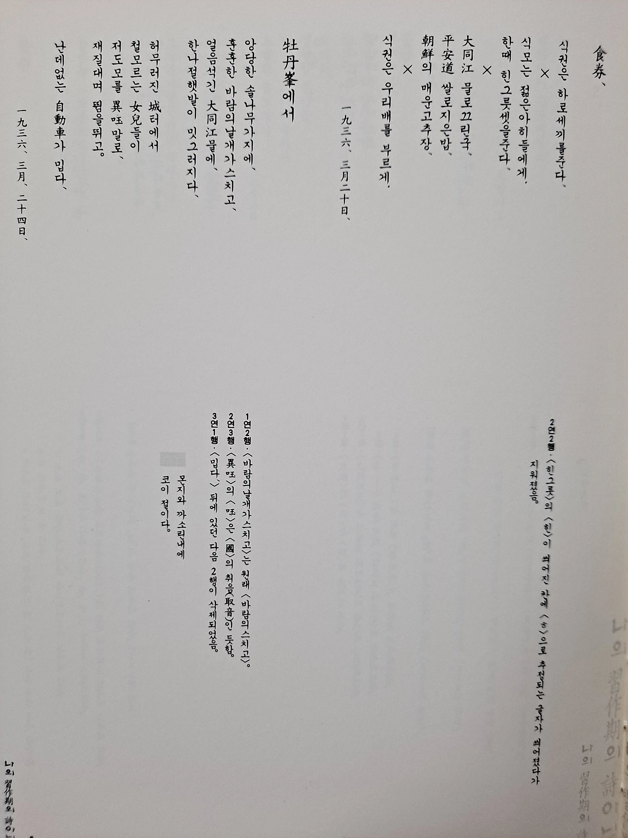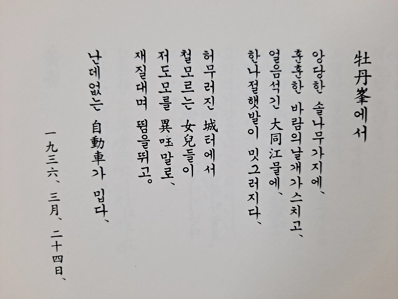 <모란봉에서> 이 작품은 1936년 3월 24일 작품으로 평양에 소재한 모란봉에서 일본어 노래를 부르는 아이들의 모습을 보고 쓴 시라고 한다. 이국말로 노래하는 조선의 아이들의 모습과 허물어진 성터의 모습은 식민지화된 조선의 모습을 잘 보여주고 있다. 이를 통해 느낀 시인의 의분은 문명이라는 이름으로 조국의 숨통을 조여 오는 일제의 침략 행위를 상징하는 자동차를 통해 표출되고 있다.