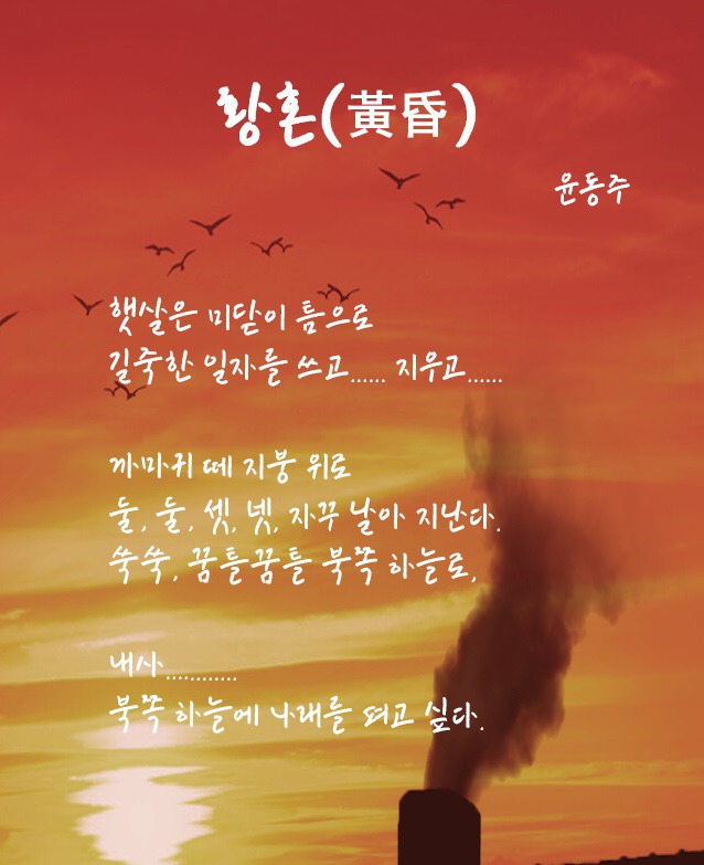 * 나는 윤동주 시인의 모든 작품과 윤동주 시인의 삶에 관한 책을 쓰려고 자료를 모으고 있는 중이다. 그리고 나는 제주 4.3과 우리나라 해방정국에 관한 작품을 쓰기 위하여 고민하는 과정에서 융동주 시인을 다시 만나고 있다. 나는 오랫동안 시인으로 살지 못했다. 앞으로 남은 삶을 시인으로 살기 위하여 부활을 꿈꾸고 있다. 앞으로도 상당기간 준비 기간이 필요할 것 같다. 최승호 시인의 말씀이 많은 도움이 될 것 같다. 그리고 윤동주 시인의 "모든 죽어가는 것을 사랑해야지" 이 문장이 나의 앞길을 밝히는 등대가 될 것이다. 그리하여 나는 지금 윤동주 시인을 다시 만나서 새롭게 배우고 있다.