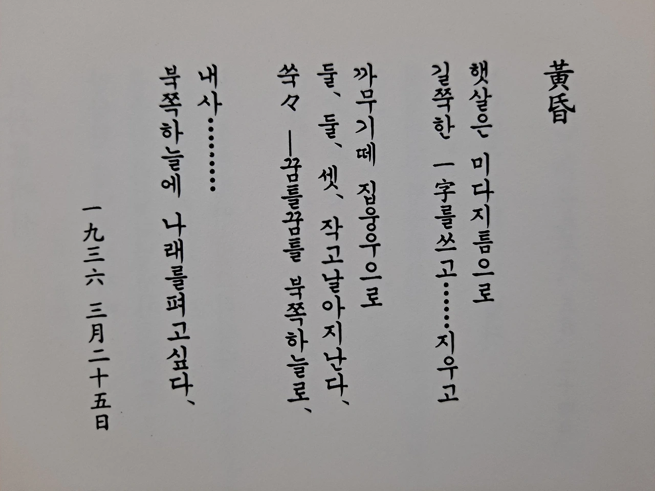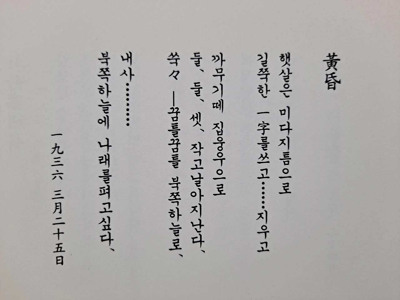 1936년 3월 25일 평양에서 쓴 작품으로 해가 질 무렵 북쪽 하늘로 날아가는 까마귀 떼를 보며 느낀 바를 쓴 작품이다. 해가 지는 황혼의 모습은 마치 일제 치하로 정체성을 잃어가는 조선의 모습을 보여주는 것과 같다. 그 암담한 현실 속에서 까마귀와 같이 북쪽 하늘로 도피하고 싶은 시인의 심정을 노래한 것으로 보인다.