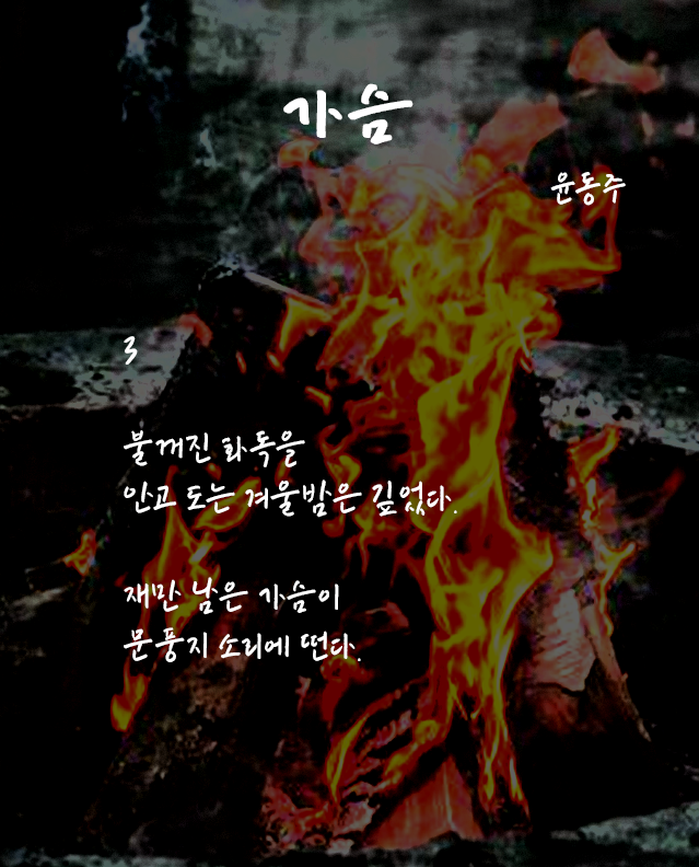 <가슴 3>은 1936년 7월 24일 쓰인 작품으로 바람이 강하게 부는 겨울에 꺼져가는 화독을 끌어안고 밤을 보내는 모습을 그린 작품이다. 탈 대로 다 타버려 싸늘한 재만 남았다고 묘사하는 화자의 심정은 독립이 요원해진 조국의 현실에 지친 탓인지 더 춥고 쓸쓸하게 느껴진다. 작품을 쓴 날은 여름인데 겨울을 노래하고 있다. 좀 더 연구가 필요할 것 같다. <가슴 2>는 봄에 가을을 노래하고 <가슴 3>은 여름에 겨울을 노래하고 있다.
