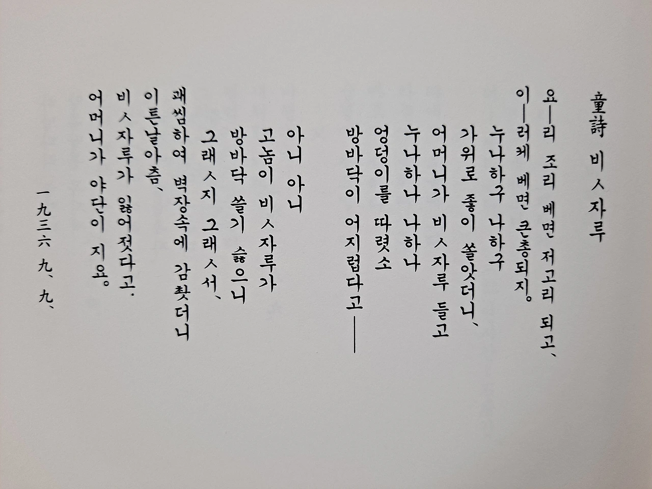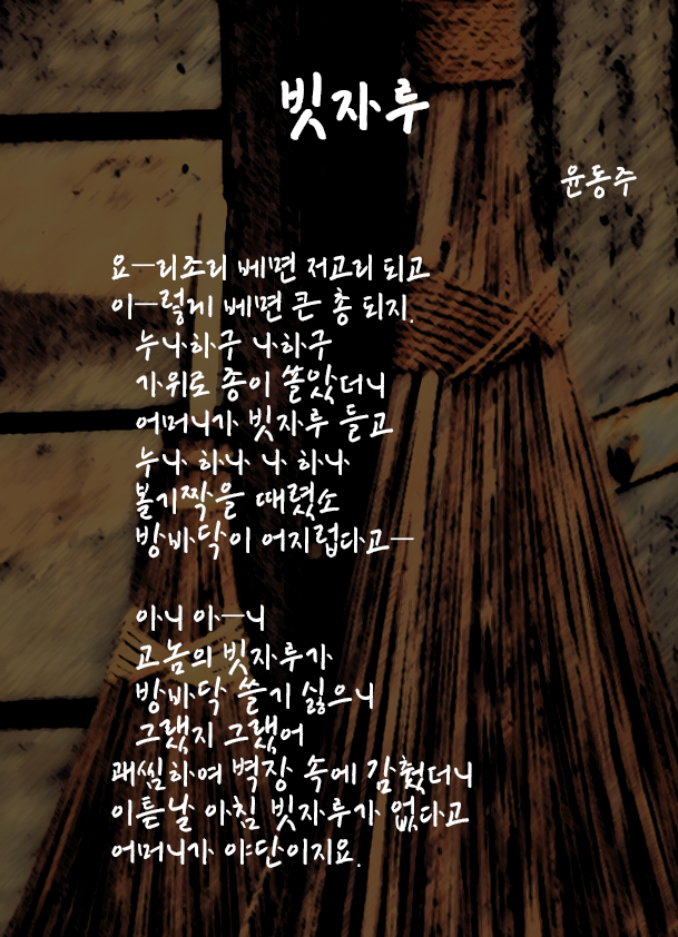 1936년 9월 9일에 쓰인 이후 같은 해 12월 간도의 연길에서 발행하던 <가톨릭 소년>에 게재된 동시로, 종이 오리기를 하던 시인의 유년 시절이 아주 구체적이고 재미있게 묘사된 시다. 시인으로 추정되는 아이가 어질러진 방바닥 때문에 엄마에게 혼난 이후, 매질의 책임을 빗자루에게 전가시키는 모습에서 어린아이의 순수한 동심이 너무나도 잘 느껴진다.