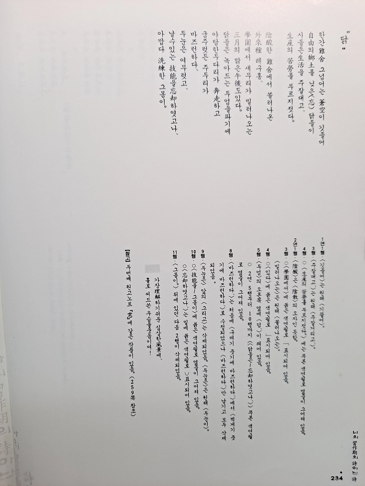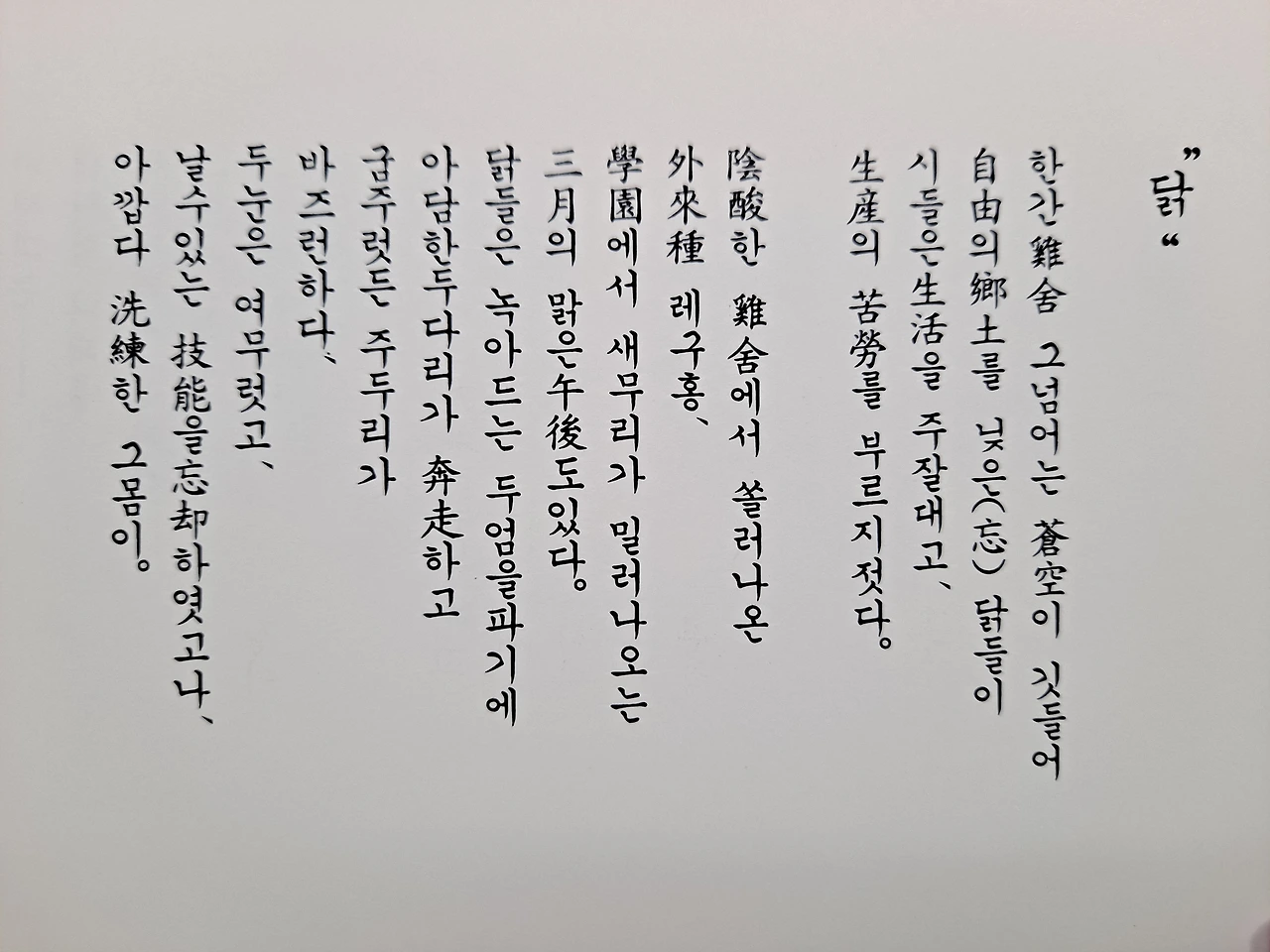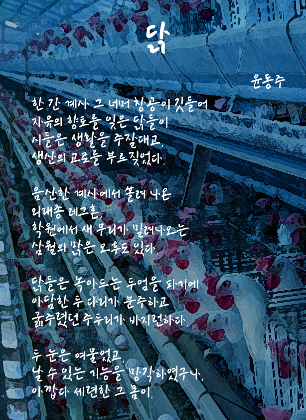 1936년에 쓰여진 작품으로 닭장 안에서 열심히 알을 생산하는 동안 날아다니는 방법을 잊어버린 닭에 대한 안타까움이 묻어 나오는 시다. 닭장 안에 갇혀 열심히 주잘대는 닭의 모습은 나라를 잃고 일제의 힘에 의해 강제동원 되었던 조선인들의 안타까운 현실을 떠올리게 한다. 하지만 이런 음울한 현실에도 포기하지 않고 열심히 녹아드는 두엄을 파내는 닭의 모습처럼 현실에서도 꽁꽁 얼어붙은 현실이 조금씩 풀릴 수 있다는 작은 희망을 그려보려는 화자의 모습을 엿볼 수 있다.