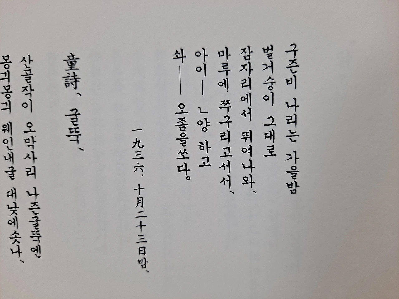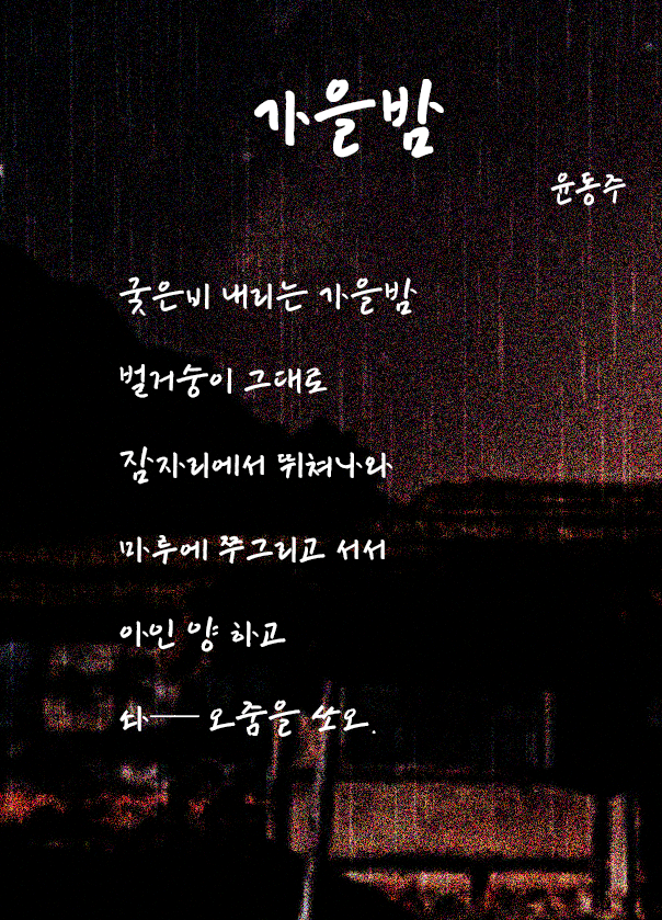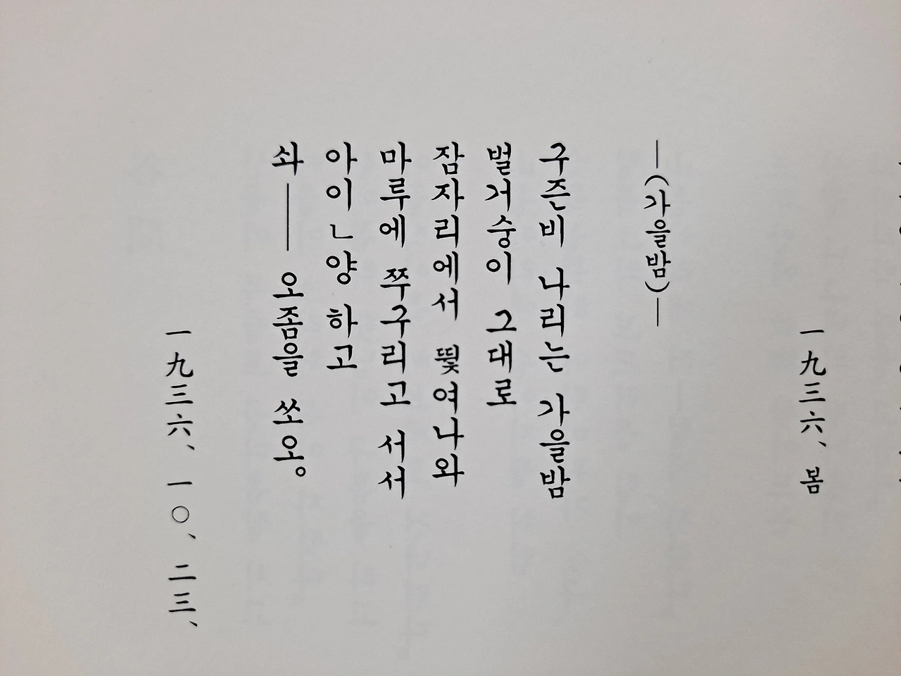 이 작품은 아주 간단한 내용이다. 나도 어린 시절에 많이 했는데 밤에 마루 끝에 서서 마당으로 오줌을 싸는 모습을 보여주고 있다. 가을밤에 자다가 일어나 마루에서 오줌을 싸는 모습이 눈에 선하다. 아마도 윤동주 시인도 밤에 오줌을 싸고 몸을 떨었을 것이다. 사실은 가을뿐만 아니라 봄이나 여름에도 오줌을 싸면 몸이 순간적으로 추워져서 떨렸을 것이다. 따뜻한 오줌이 몸에서 빠져나가면 순간적으로 체온이 떨어져서 몸을 떨었을 것이다.