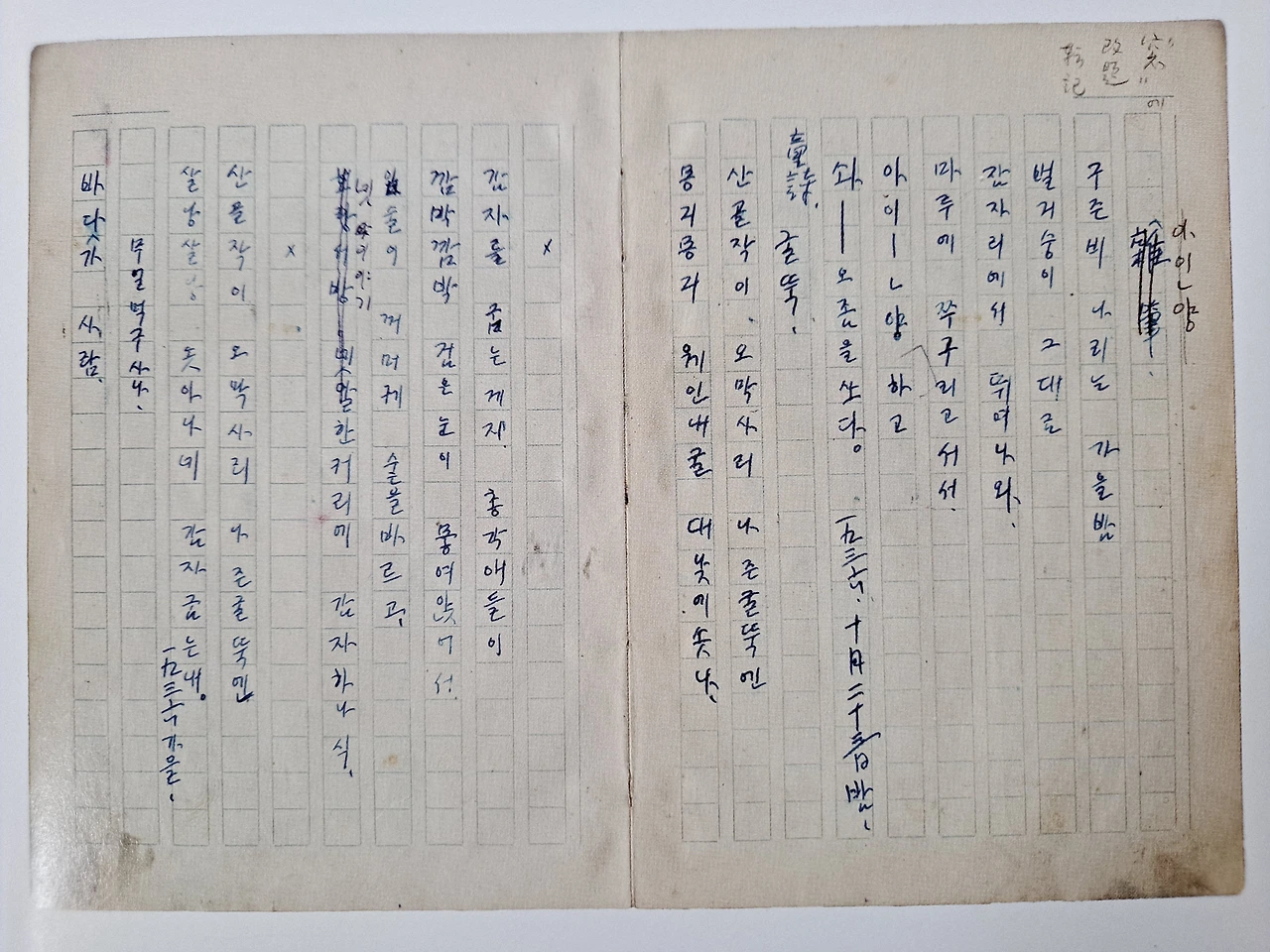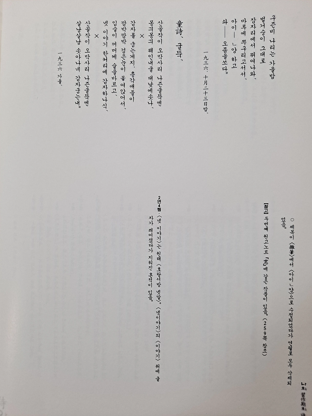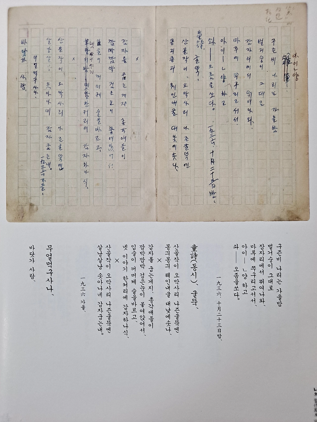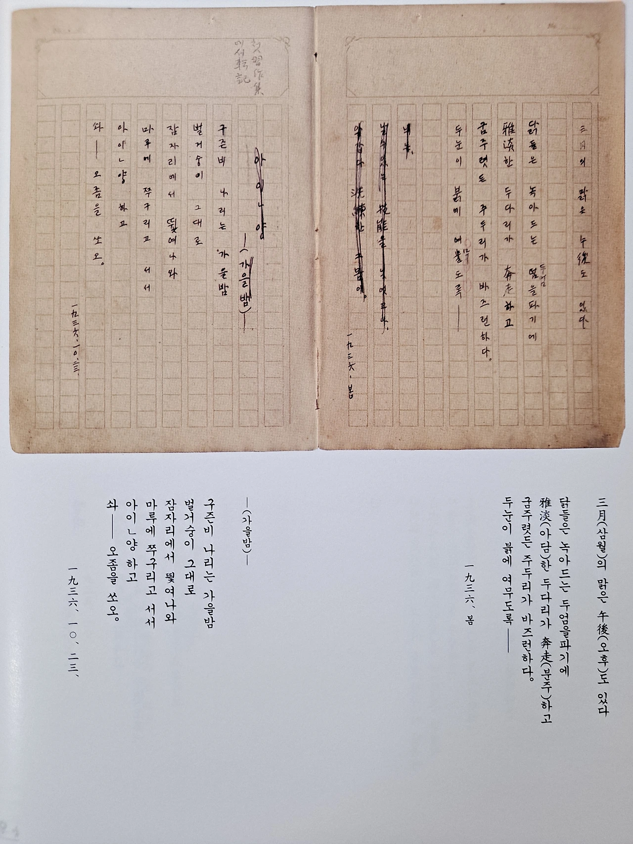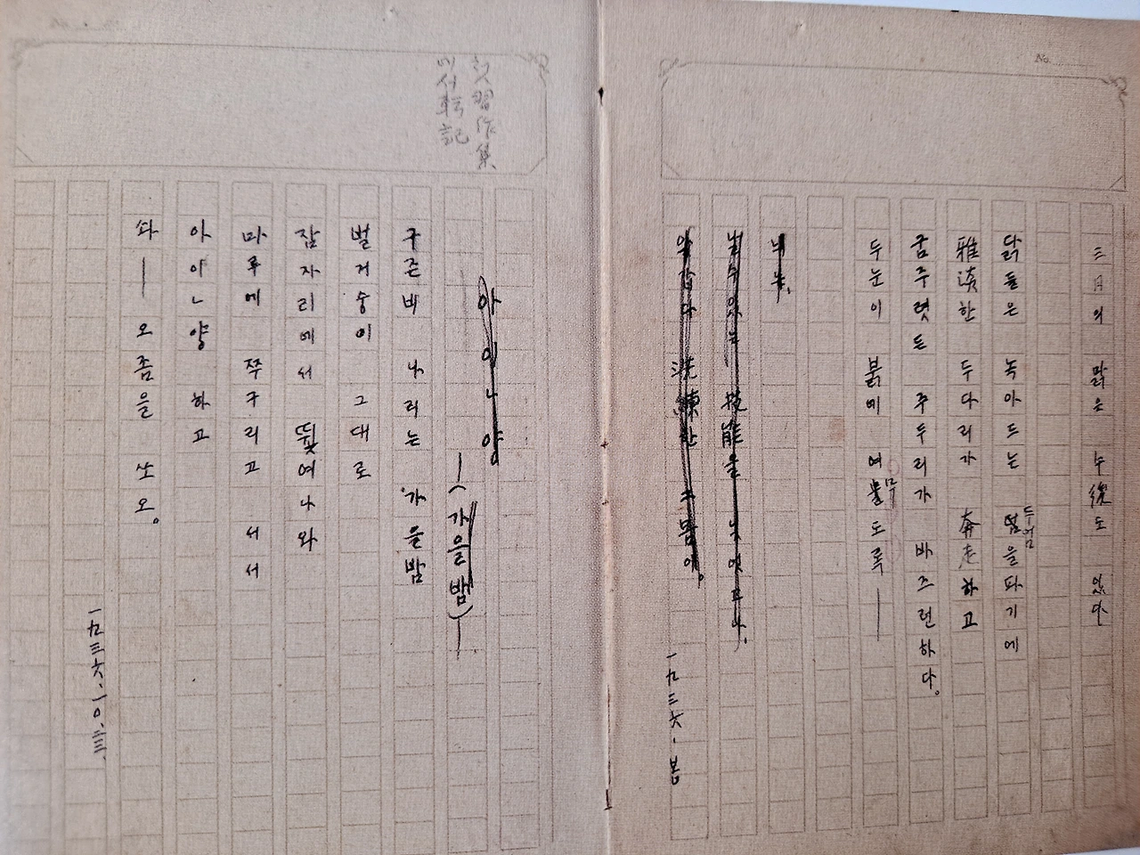 이번에 올리는 <가을밤>은 『나의 습작기(習作期)의 시(詩) 아닌 시(詩)』에는 제목이 없다. 차례에는 <잡필(雜筆)>이라고 썼다. 그리고 본문에서도 처음에는 제목을 <잡필(雜筆)>이라고 썼다가 지우고 <아인 양>으로 고쳐 썼다가 이 또한 지웠다.